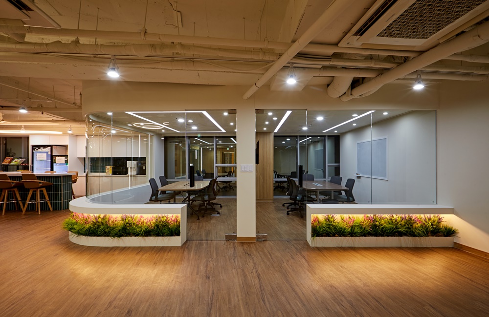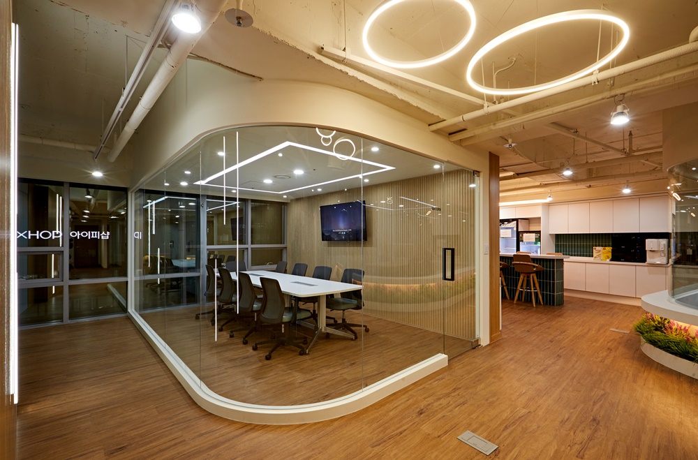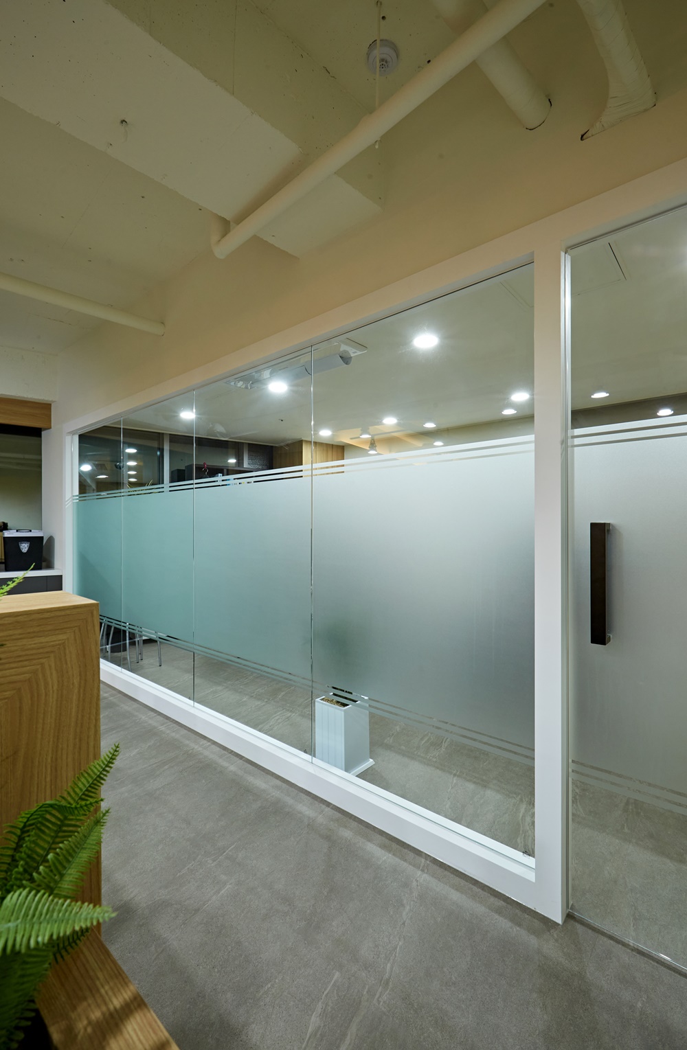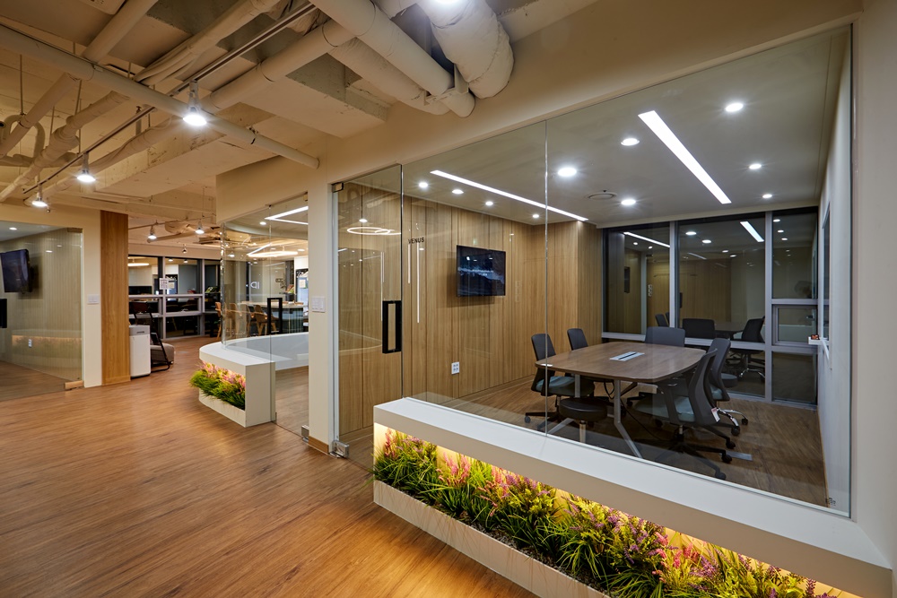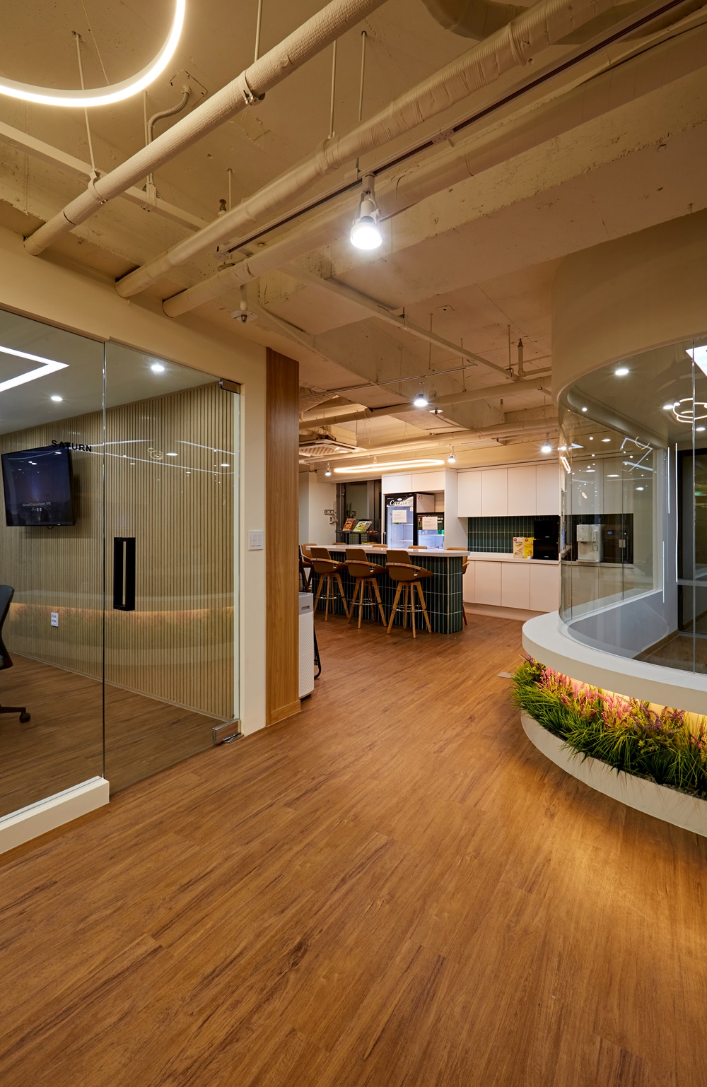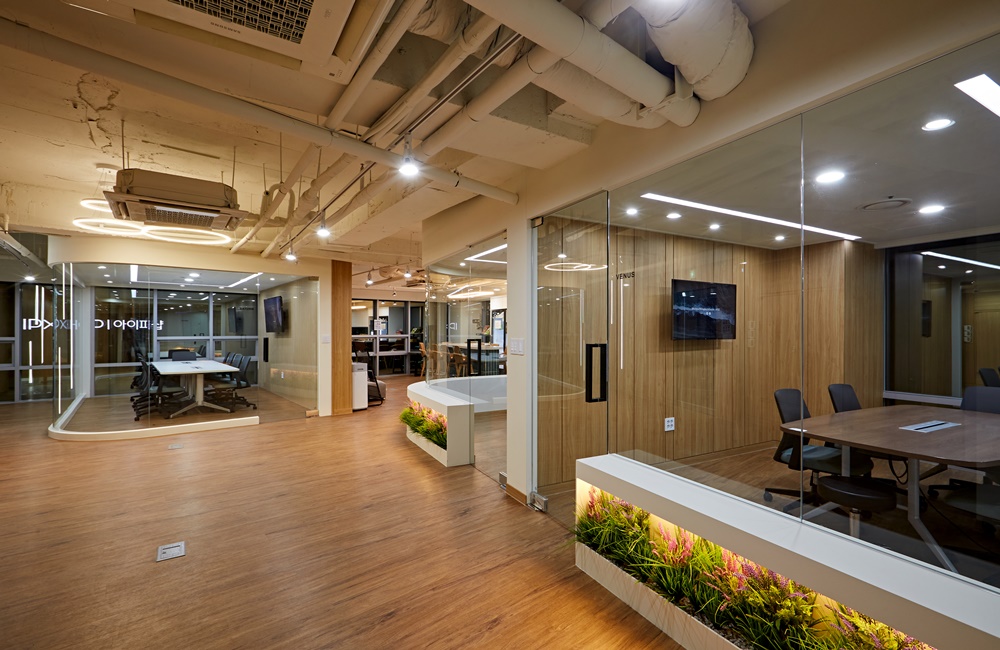 노출천장의 높은 층고는 개방감을 극대화하면서 유리 가벽을 통해 공간 간의 시야를 확장시켜 답답함 없이 업무에 집중할 수 있는 환경을 만들어주었죠.
