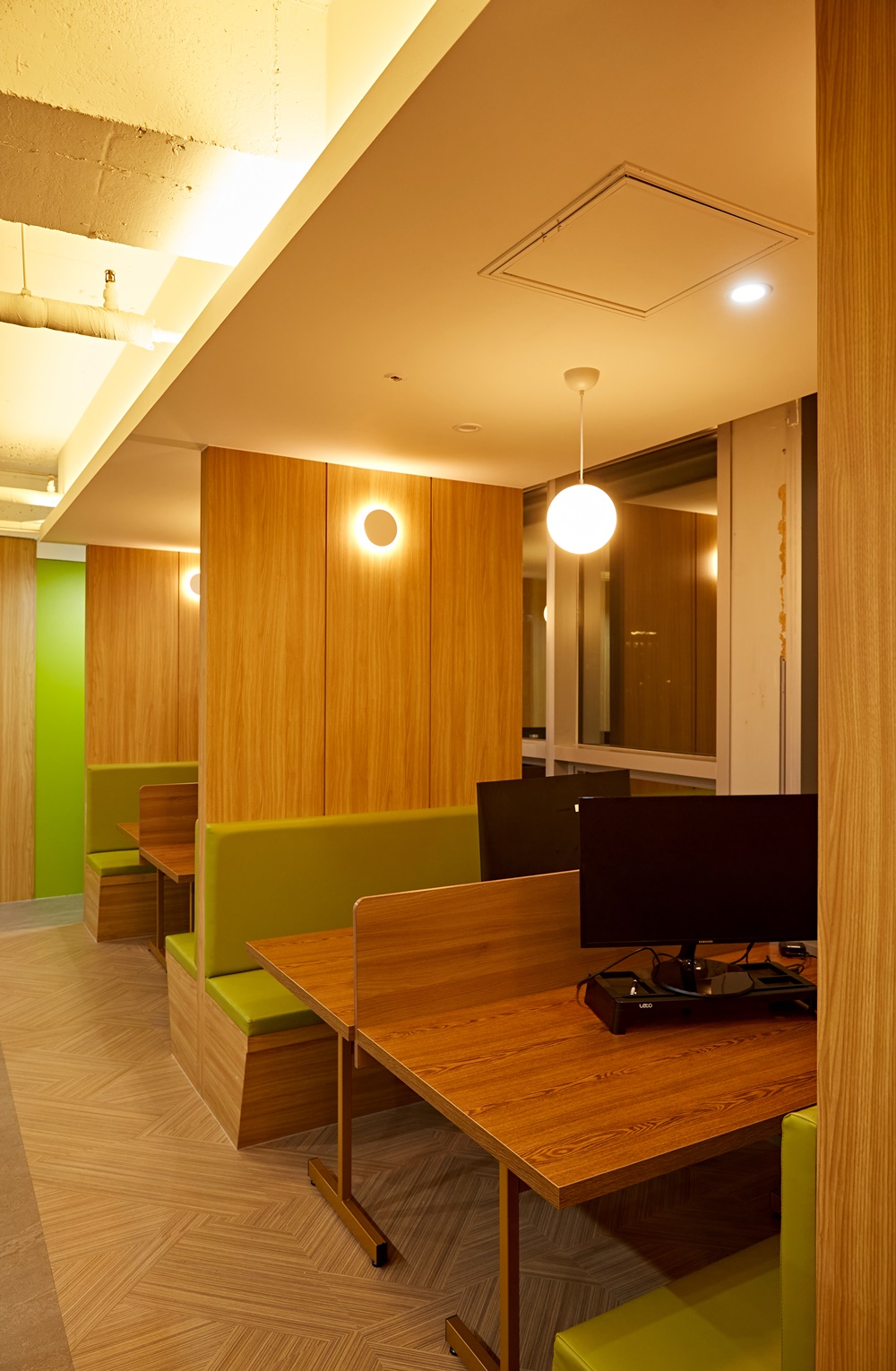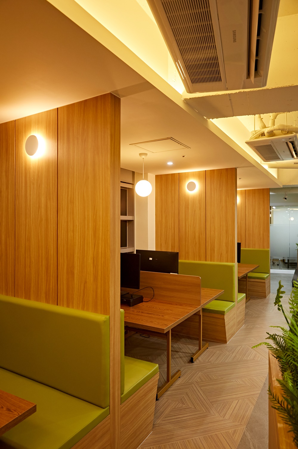 유리 가벽을 통해 부스 형태의 공간을 여럿 마련하여 팀 단위 소모임과 협업이 가능하도록 설계했어요.