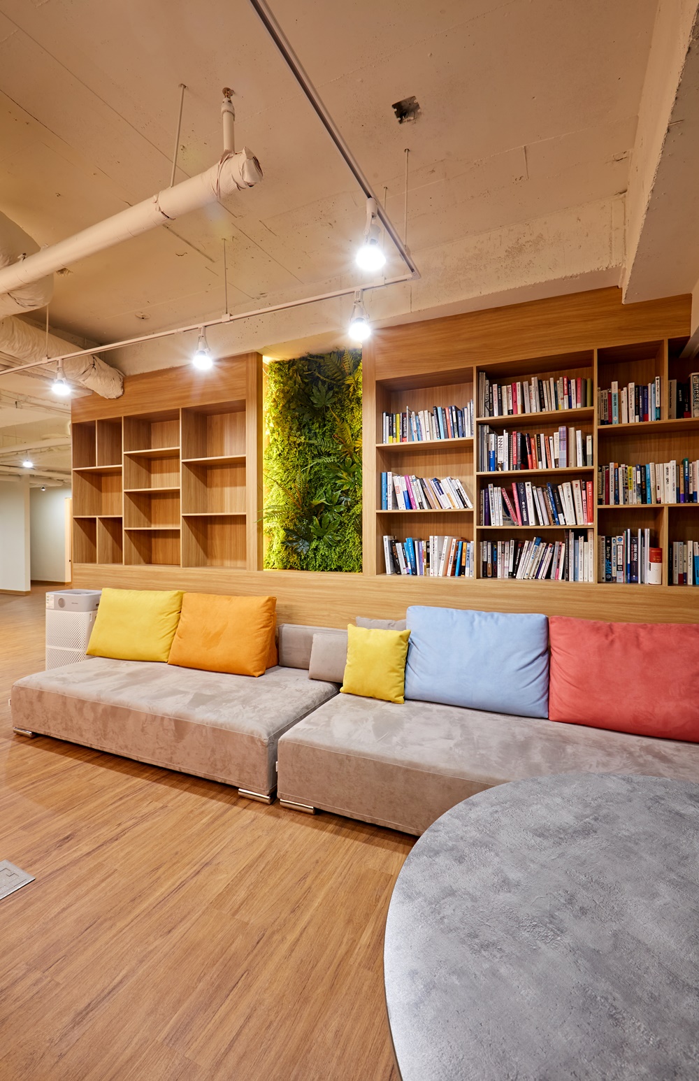 부드러운 조명 아래 배치된 편안한 소파와 나무 소재의 테이블, 벽면 가득한 책장은 업무 스트레스를 완화시키는 요소로 작용하며 전체적인 인테리어의 완성도를 한층 높여주었죠.