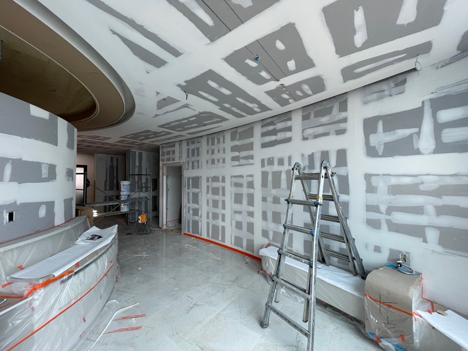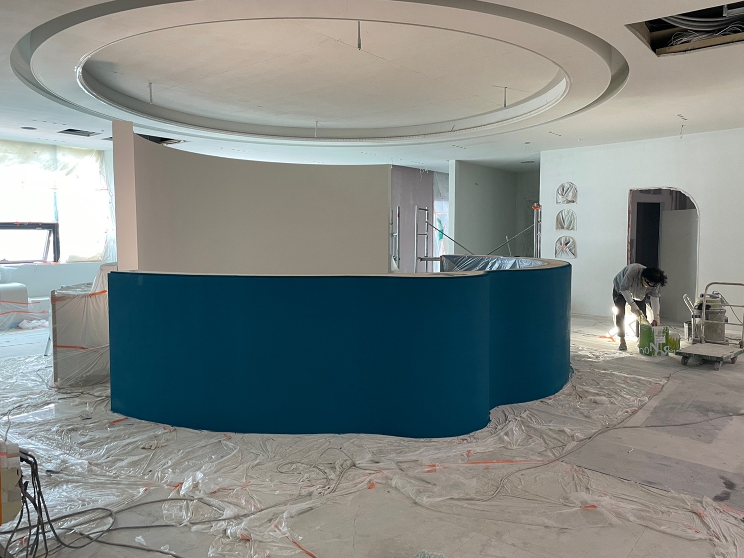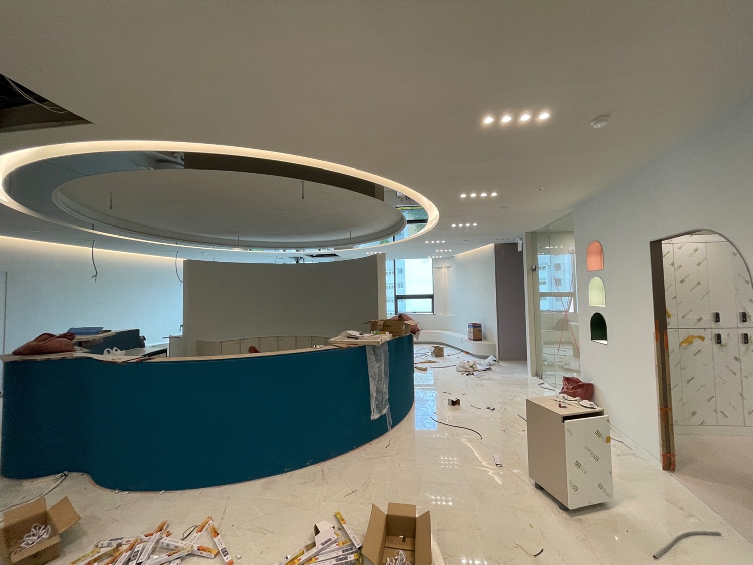 원형 데스크와 원형 천장 구조이기 때문에 단순히 둥근 틀을 만드는 것이 아니라 조명을 매립할 수 있을 만큼의 깊이와 간접조명이 자연스럽게 퍼지는 틈, 그리고 구조적 안정성을 모두 고려하여 작업했기에 더욱 기술적인 요소가 필요한 작업이었습니다.