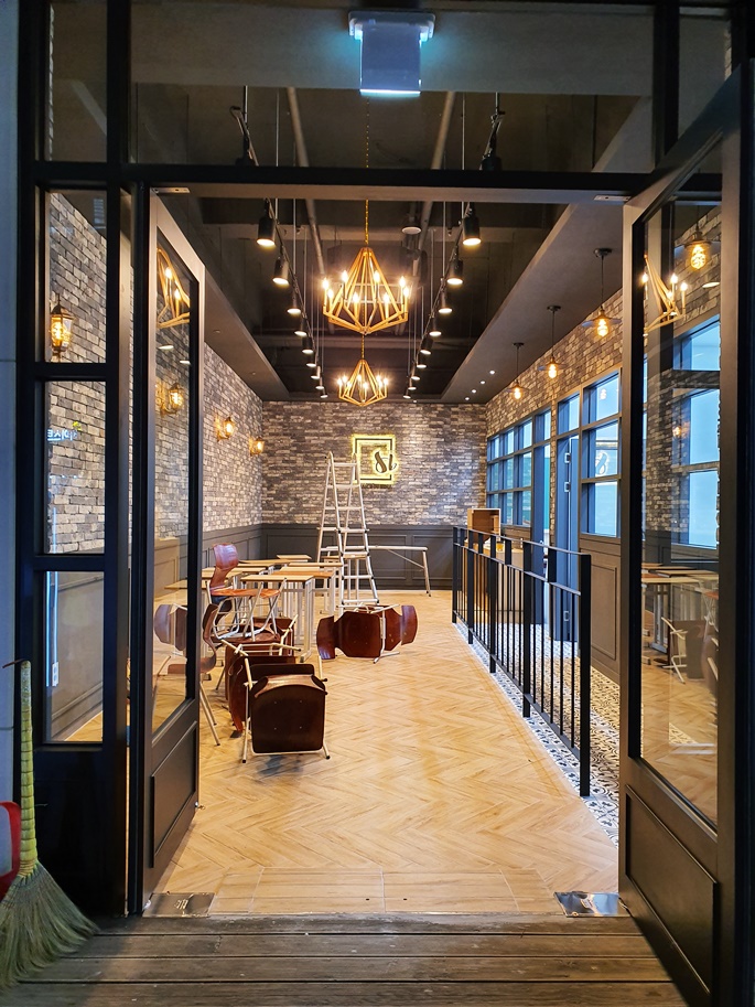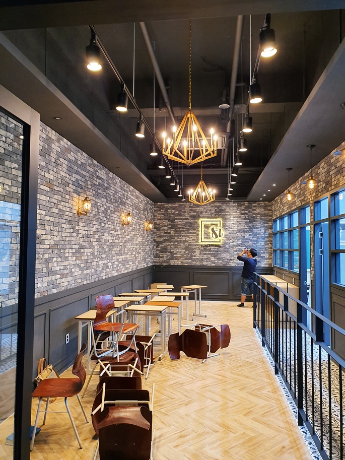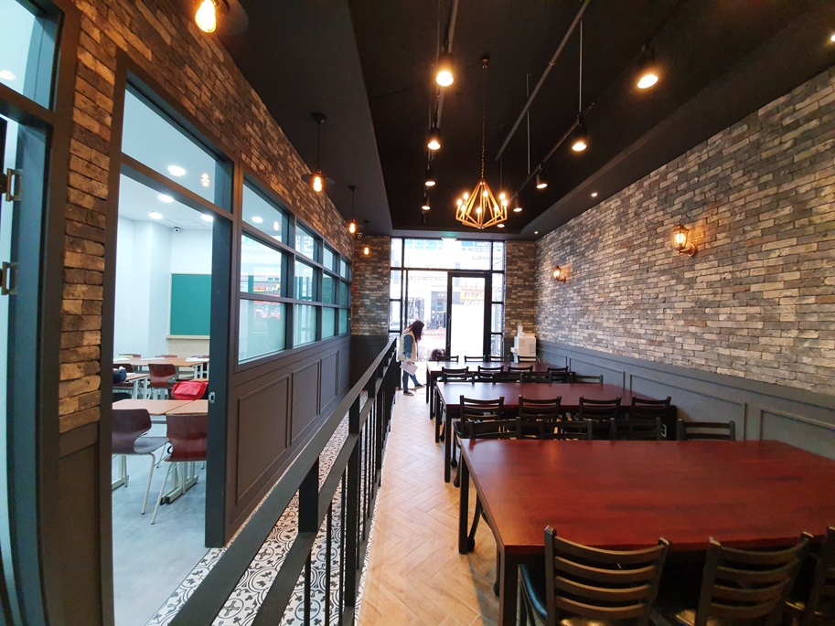입구 벽면에 시공된 로고 사인물을 가장 안쪽 벽에도 설치해 연속성을 부여함으로써 포인트가 되도록 했습니다. 노출천장, 넓은 테이블, 상들리에 조명, 벽부조명, 따뜻한 색감의 전구 등이 잘 조화되어 자유로운 카페 느낌의 인테리어가 참 멋스럽네요.