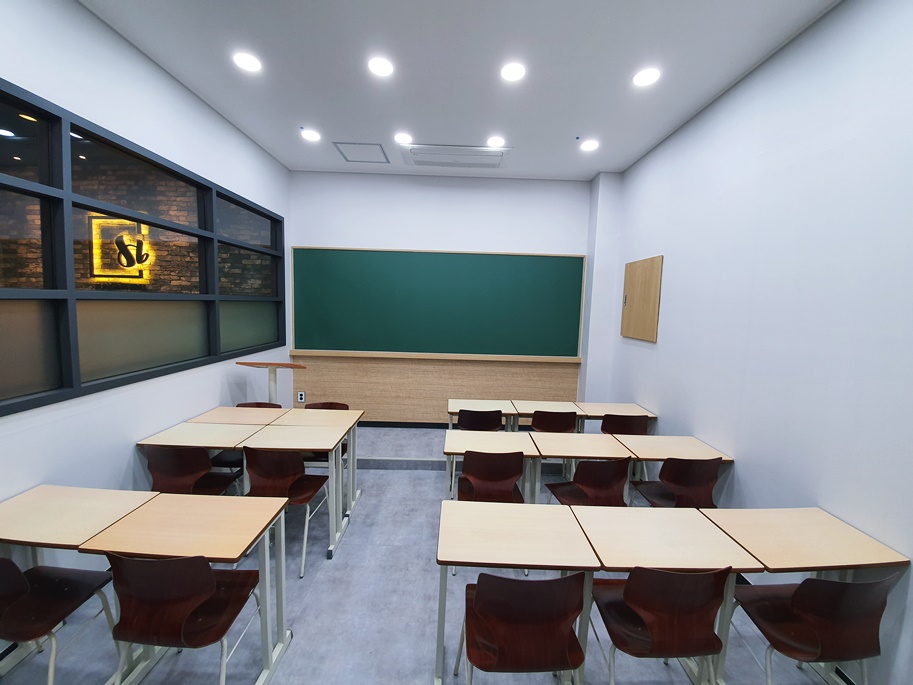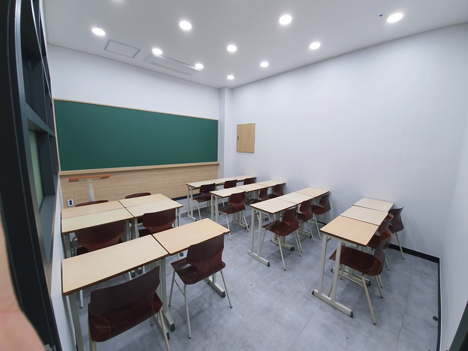 책상 배치가 끝난 강의실 내부 인테리어입니다. 전체적으로 밝고 화사한 느낌이 들도록 깔끔한 화이트와 덱스 천장을 적용해 집중력을 높일 수 있도록 했고 원형 매립등을 시공해 층고와 충분한 조도를 확보할 수 있도록 했습니다. 바닥은 책상과 의자의 끌림에 강한 빈티지형 노출바닥으로 시공했고 1층이어서 방음재는 넣지 않았습니다.