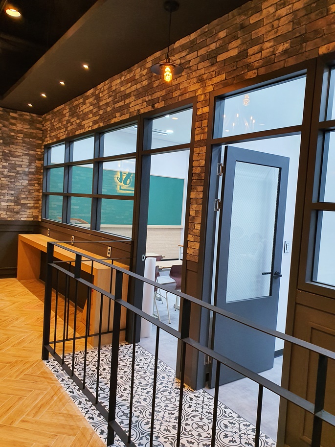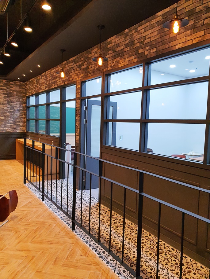자율학습 영역과 강의 영역은 가벽으로 분리했습니다. 가벽은 답답한 목공이 아닌 목공과 창문을 복합적으로 섞은 형태로 시공해 수업하는 학생들을 밖에서 볼 수도 있고 내부에서 공부하는 학생들은 답답함을 해소할 수 있도록 했죠. 자율학습 영역과 강의 영역으로의 진입동선은 철제 난간을 설치하고 바닥 마감을 달리함으로써 명확하게 나눠 가독성을 높였습니다.