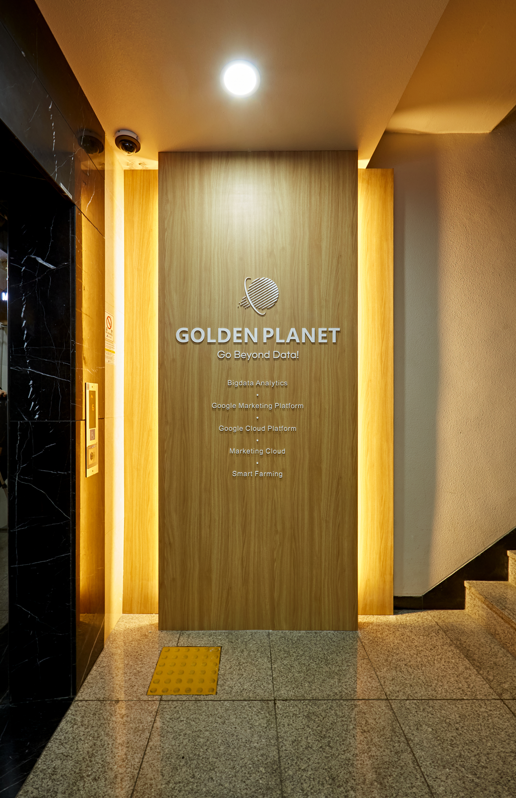 입구 벽면에는 회사의 상호명을 중심에 배치하고 조명을 활용해 은은하게 빛이 감돌게 연출했으며,