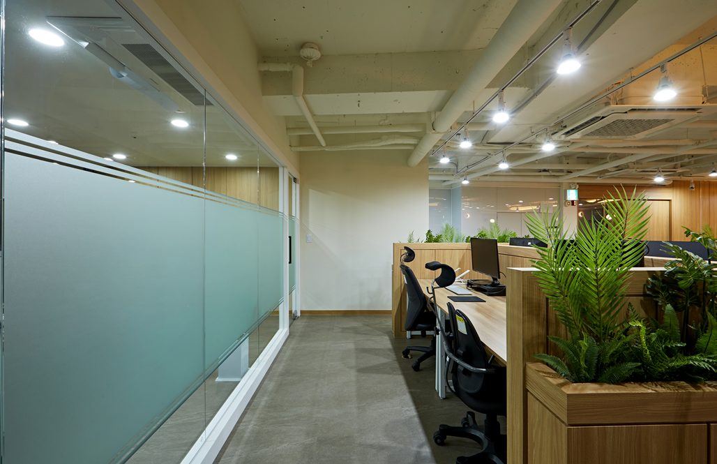 사무실 디자인에서 공간의 흐름은 매우 중요한 요소인데요. 원목 가구와 플랜테리아, 유리 가벽을 활용하면서도