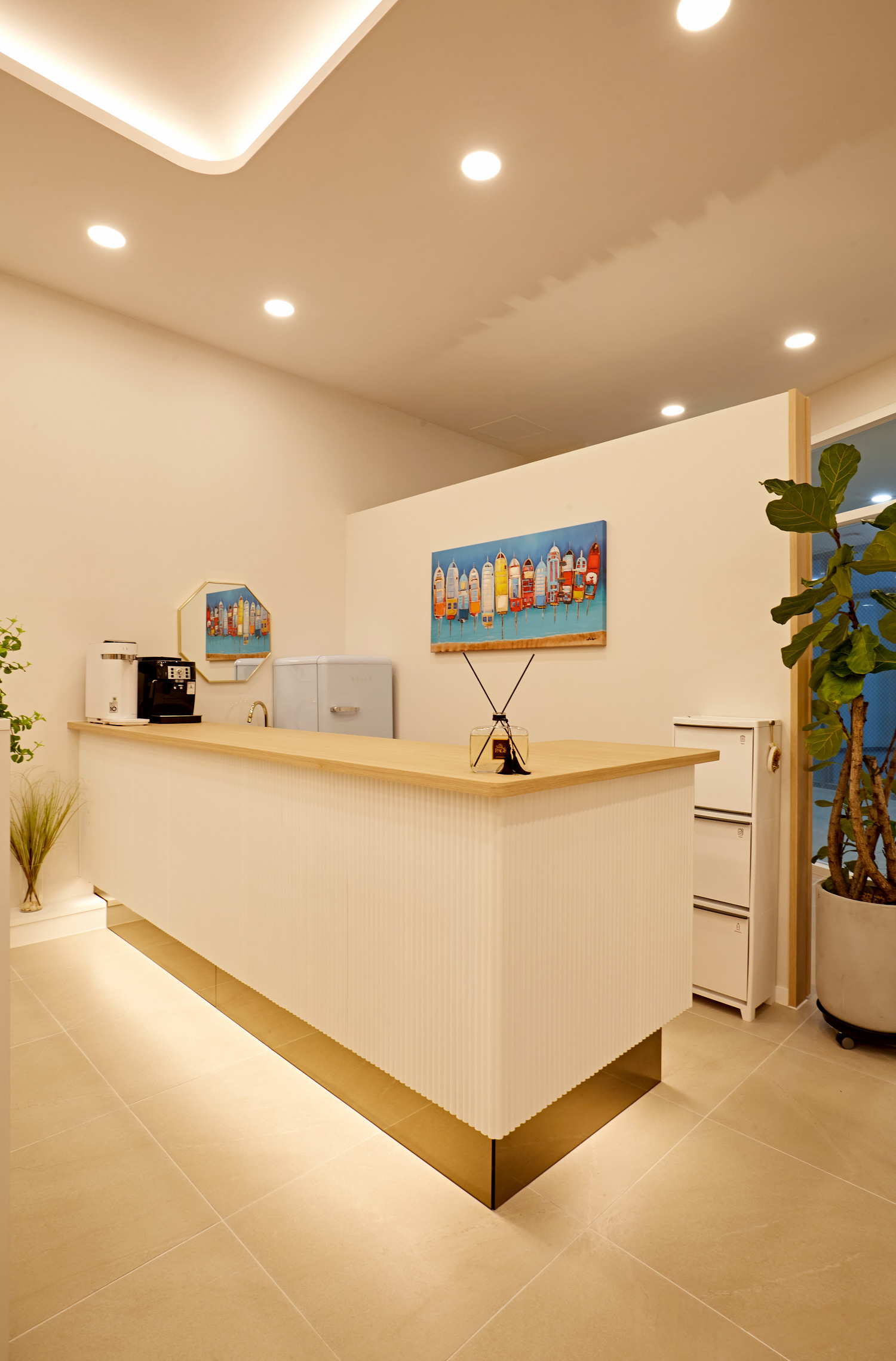 영등포 동작 사무실인테리어의 외관 모습입니다. 통유리로 내부가 훤히 보이도록 시공하였으며 화이트 프레임과 원목의 조화로움을 이뤘습니다. 그리고 보이는 내부 로비도 원목 파사드로 제작하여서 통일감을 높였으며 왼쪽으로는 타원형의 조형물과 벽등으로 매력도를 높였는데요. 멀리서보더라도 한 눈에 보이는 공간임은 물론 고급스러운 인테리어가 사무실의 품격을 높여주고 있습니다.