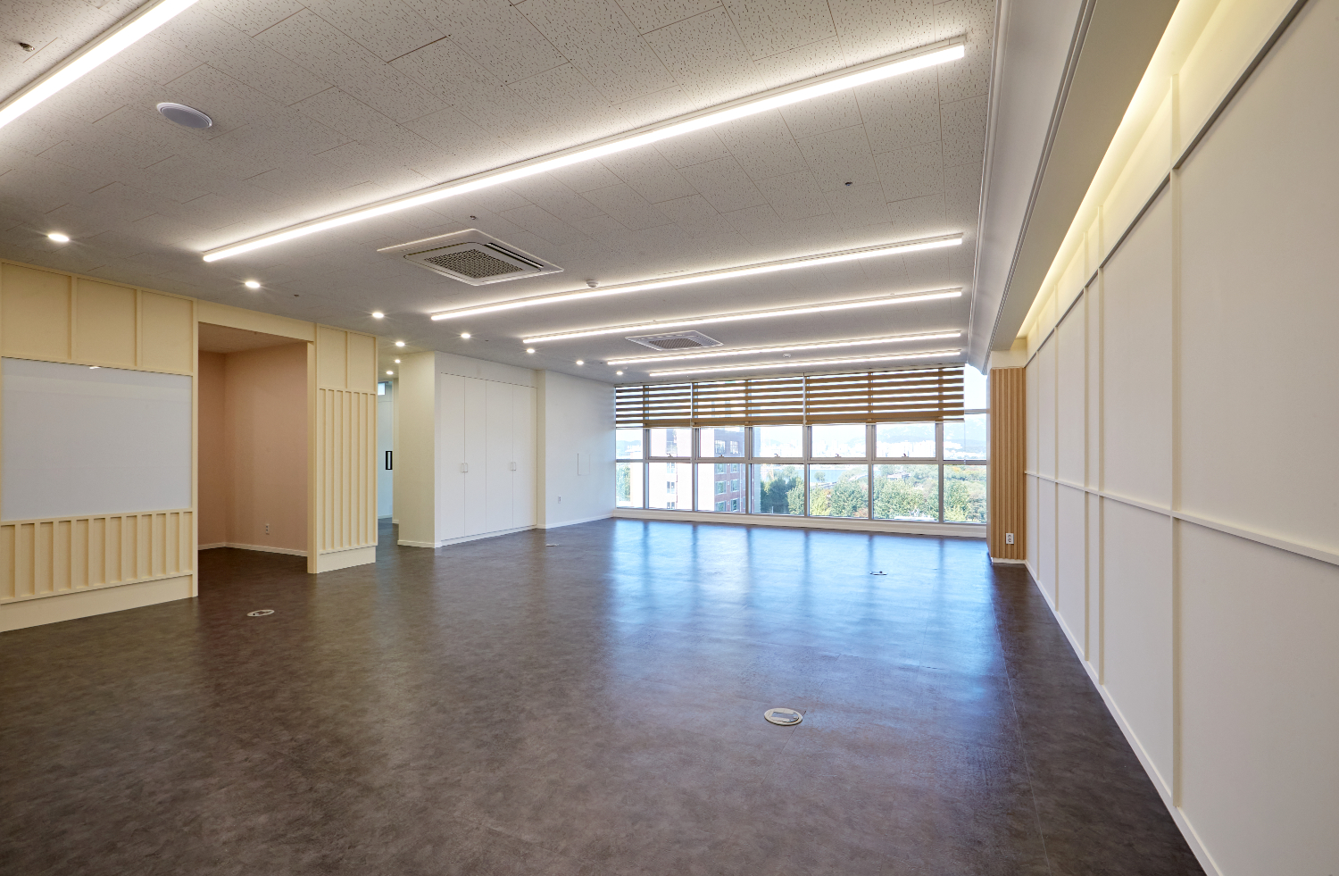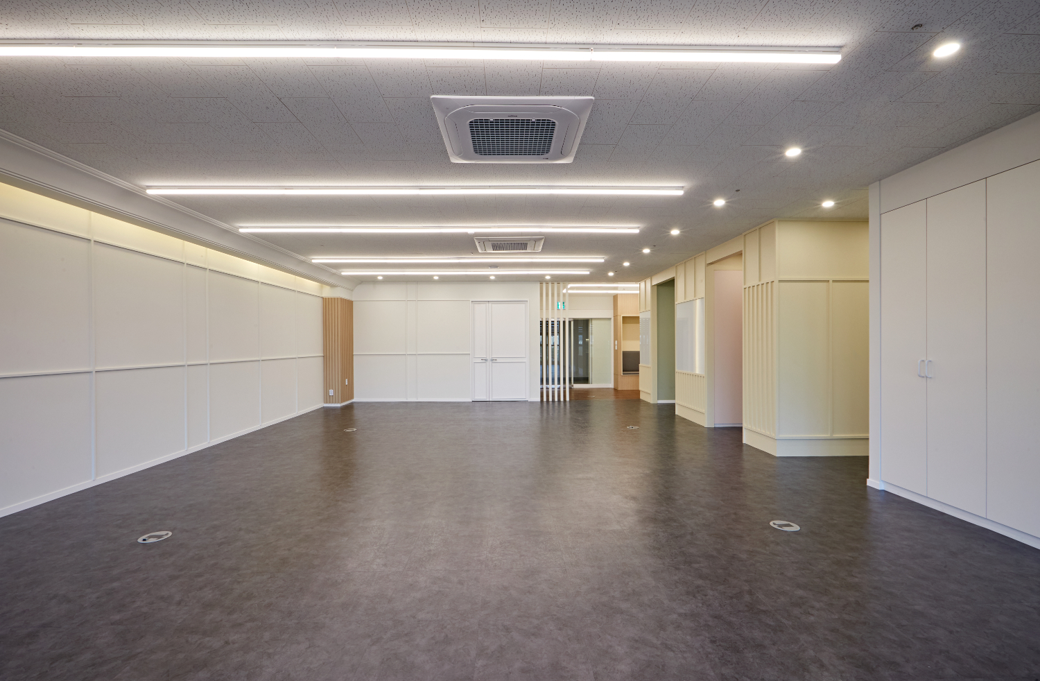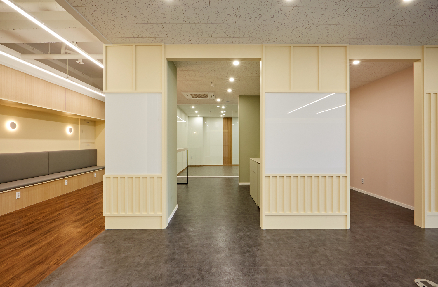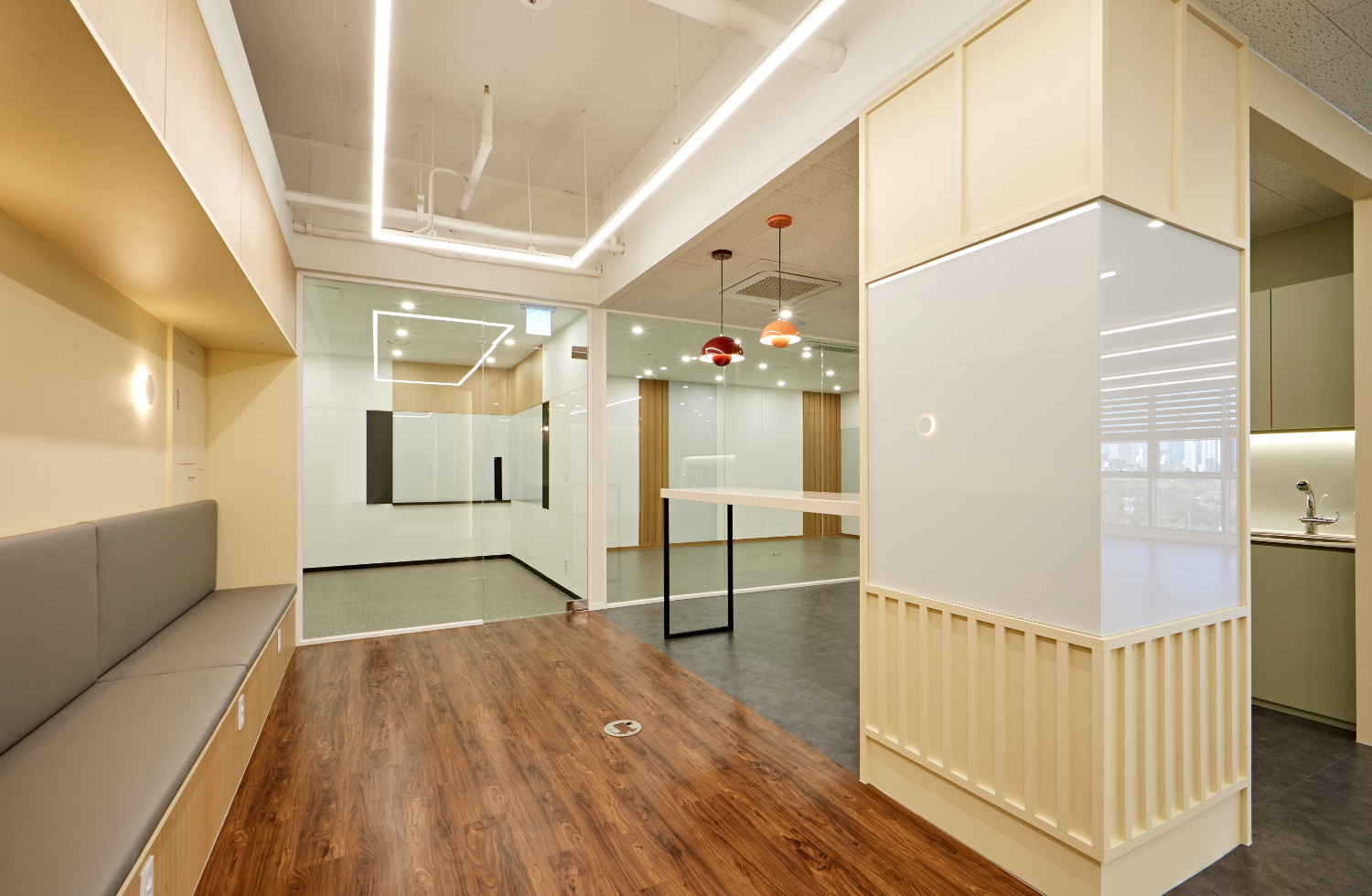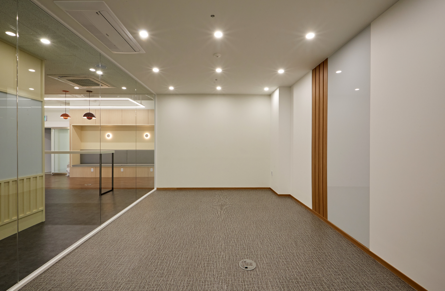 또한 개별룸의 도어는 전체 유리로 시공하여서 훤히 보일 수 있게 만들었으며 지나가는 곳마다 보조등을 설치하여 훤히 밝혀주었습니다. 별도의 무늬가 없는 깨끗한 유리로 시공한 이유는 개방감을 위함입니다.