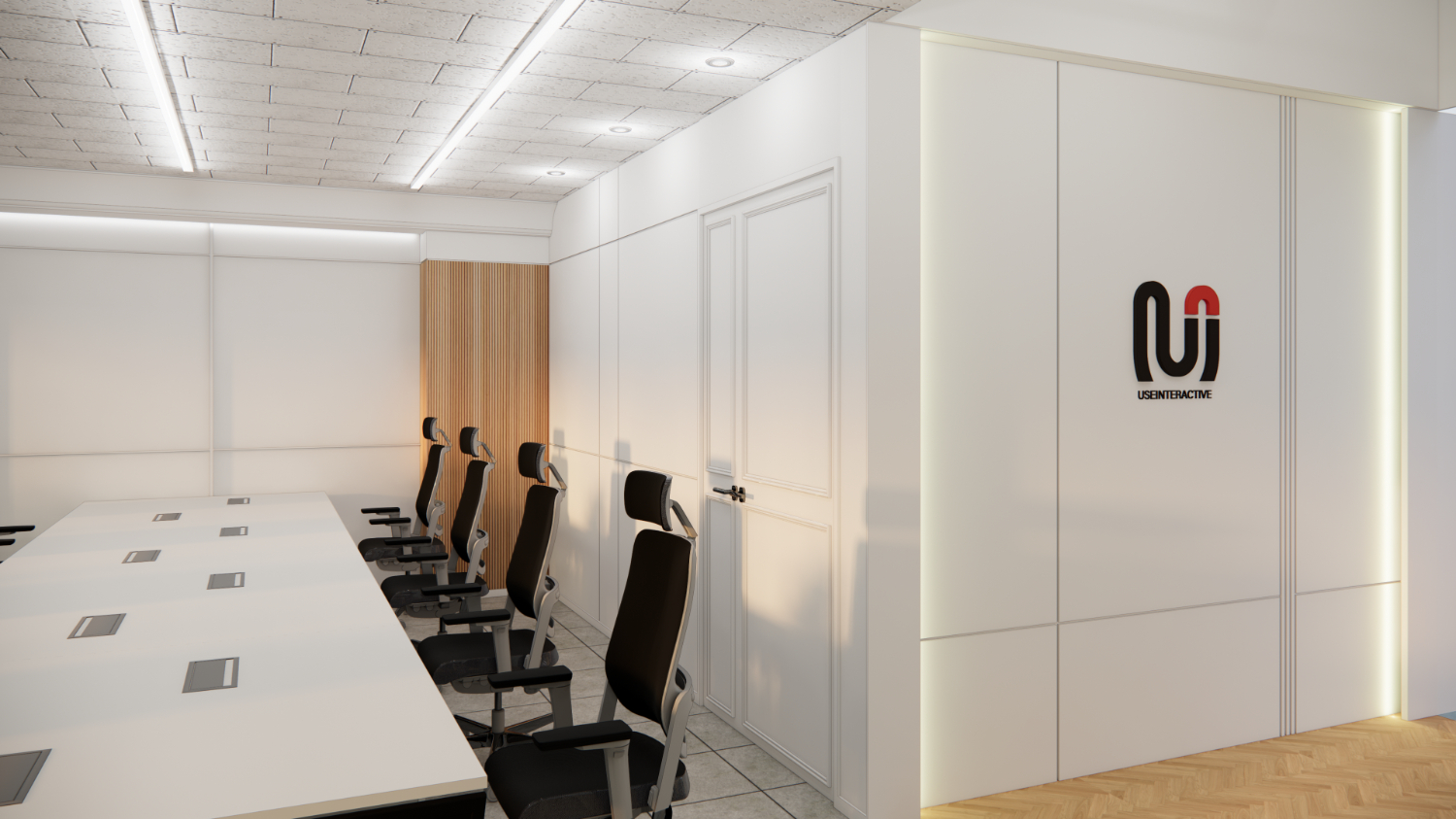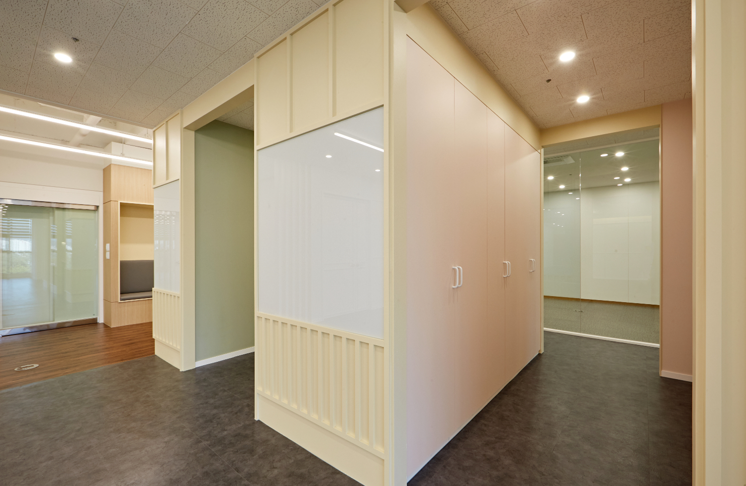 간단한 미팅이 이뤄지는 회의실은 한쪽 벽면을 화이트보드로 매립하였으며 블라인드 시공을 통해 채광을 조절하도록 하였습니다. 그리고 전체적인 색감과 소재 통일을 위하여 파스텔톤으로 이어갔는데요. 바닥은 더욱 따스한 느낌을 줄 수 있는 감성적인 브라운을 선택하였습니다.
