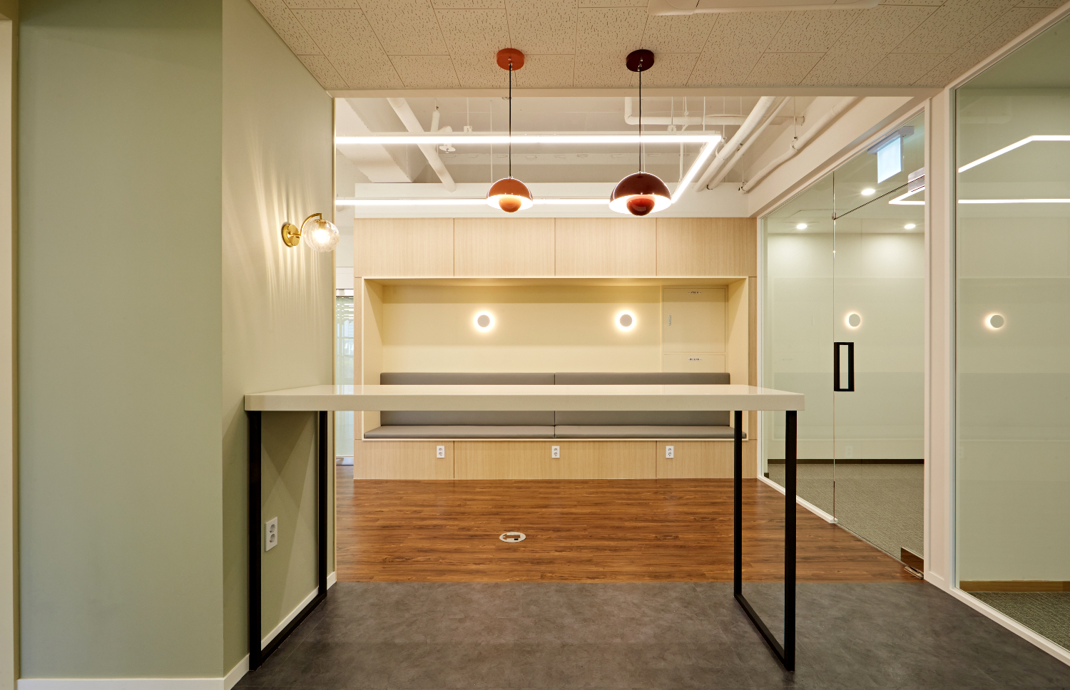 카페테리아 공간은 폐쇄적인 것이 아니라 공개적으로 시공하였는데요. 영등포 사무실인테리어 코오롱디지털타워 시공현장에서는 누구라도 편안하게 카페테리아를 이용할 수 있으며 뻔한 화이트 컬러가 아니라 전체 디자인과 어우러지면서도 마음의 평화를 줄 수 있는 그린컬러를 활용하였습니다. 거기다 대비되는 레드, 오렌지 컬러를 활용한 팬던트 조명이 빈티지한 느낌으로 공간을 밝혀주는데요.