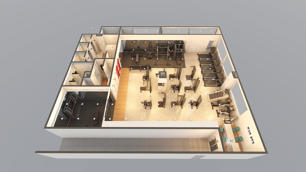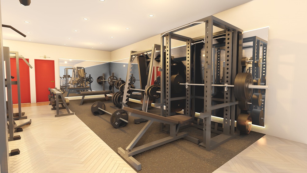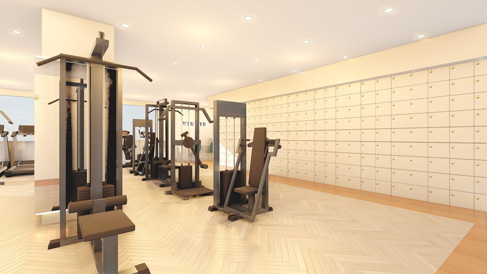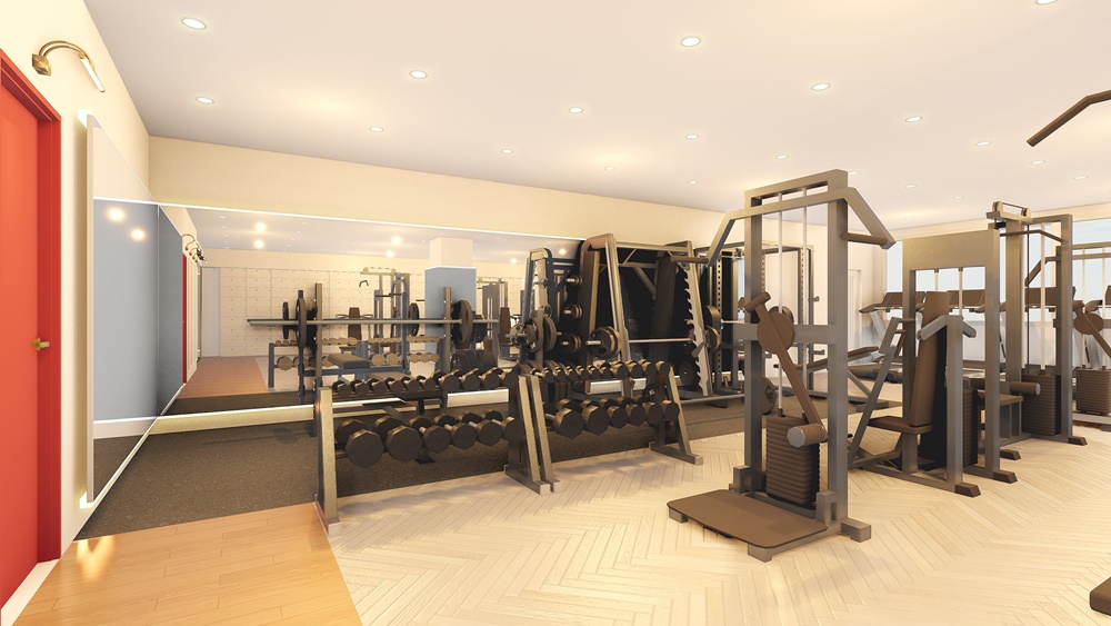 창측에는 런닝머신, 사이클머신 등을 둬 운동하는 동안 지루하지 않도록 했고 중앙에는 근력 운동을 위한 머신을 두어 운동에 집중할 수 있도록 했으며 거울이 설치된 곳에 프리웨이팅존을 구성해 개인 운동에 몰두할 수 있도록 했습니다. 프리웨이팅존은 무게 운동을 많이 하는 특성을 고려해 바닥에 고무 매트를 시공해 충격과 소음을 흡수하도록 했습니다.