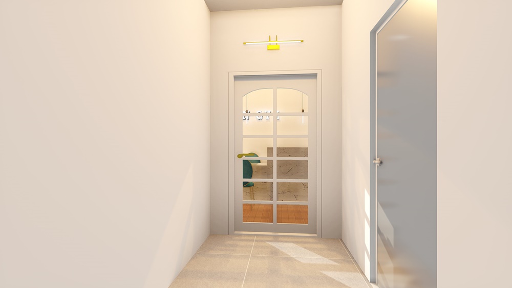 입구 파사드는 밖에서 봤을 때 내부 파사드의 모습과 조화될 수 있는 디자인을 적용했습니다. 전체적으로 화이트로 마감하고 격자 프레임으로 짜인 유리문을 적용해 내부 모습을 차경으로 활용할 수 있도록 했으며 문틀 위에 세련된 벽부등을 적용해 모던한 모습을 더욱 강조했습니다.