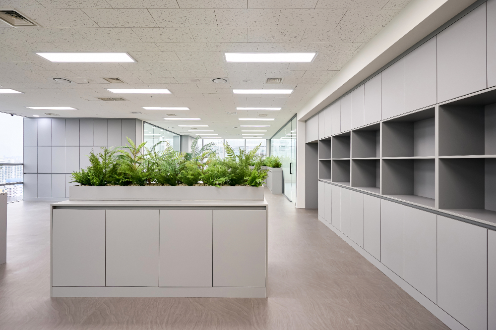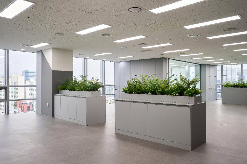 카페테리아 공간을 빠져나오면 메인 사무 공간이 펼쳐집니다. 그리고 영등포 에이스ns타워 지식산업센터인테리어의 특이한 점이 무엇인지 혹시 눈치채셨나요? 바로 공간이 분리되는 곳에 파티션이나 가벽대신 낮은 서랍장으로 구분해두었으며 그 위에는 플랜테리어를 활용했다는 점!