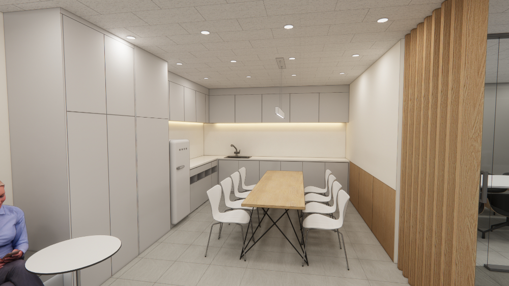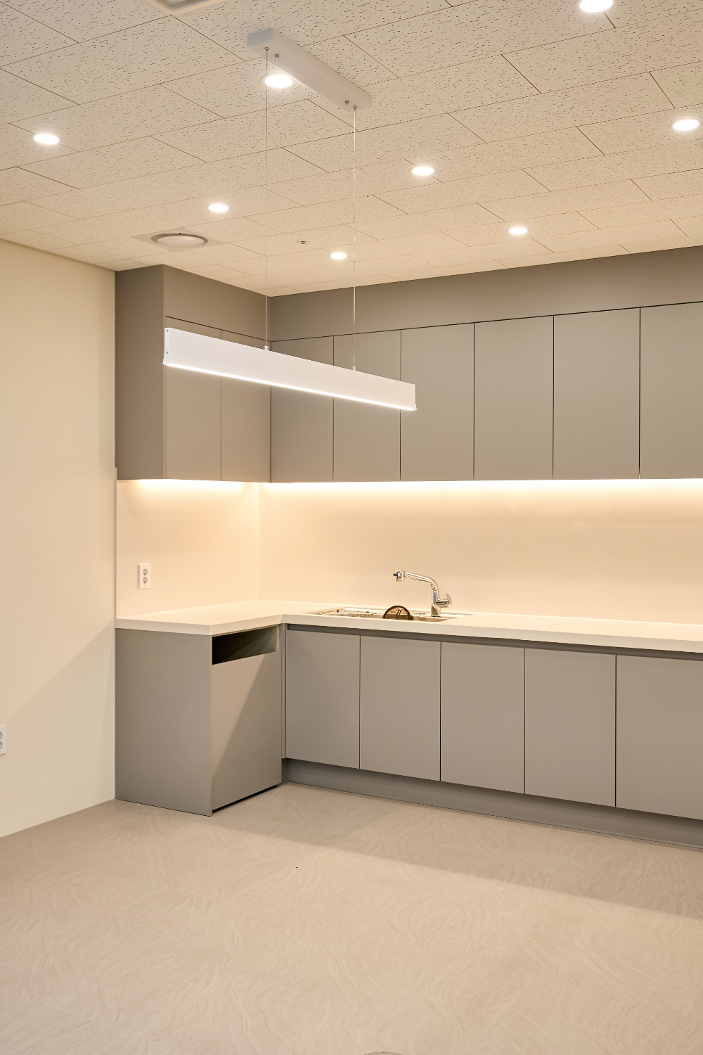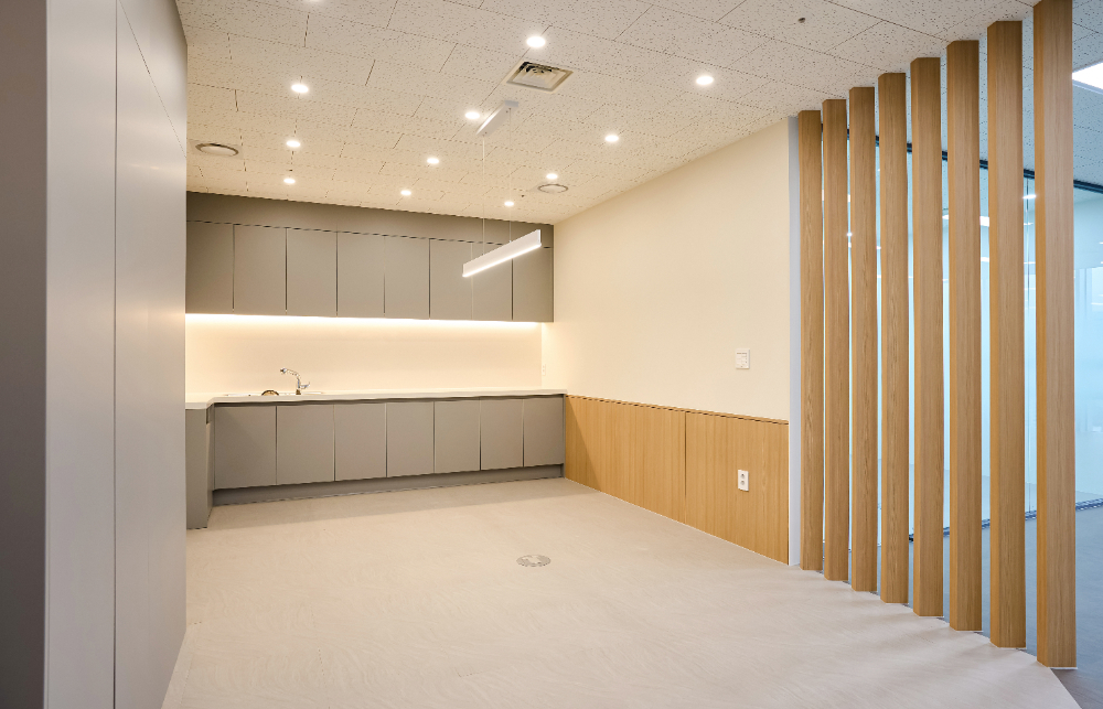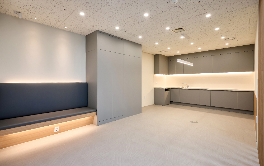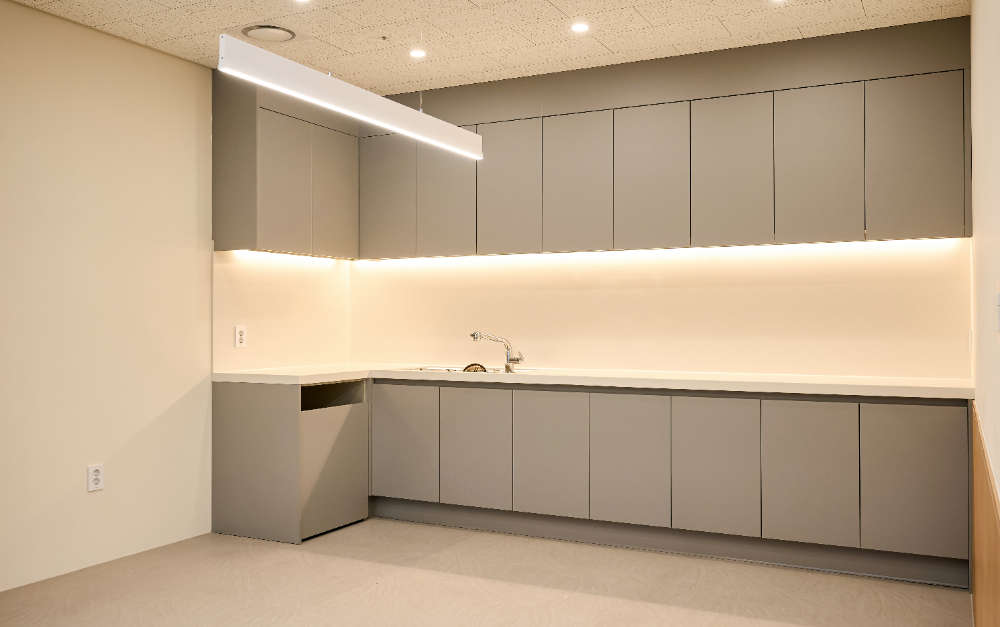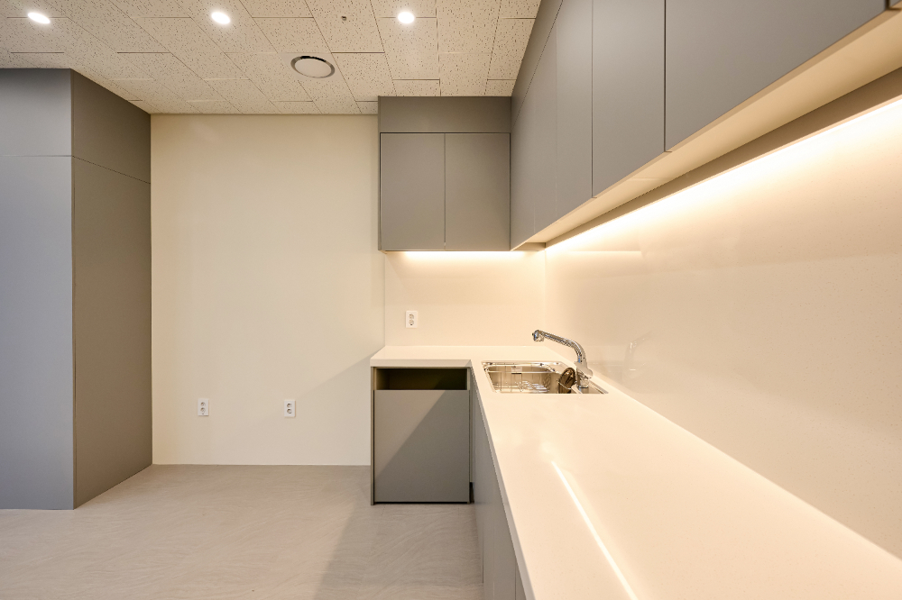 마치 가정집의 부엌인테리어를 보는듯한 이 곳은 영등포 에이스ns타워 지식산업센터인테리어의 카페테리아 공간인데요. 베이직한 톤의 무드를 잘 살려낸 곳이라 할 수 있습니다. 무광 그레이 컬러의 도어가 중심을 잡아주고 주광색의 따뜻한 조도 조명으로 밸런스를 잡아줍니다. 또한 살짝 ㄱ자로 구조를 만들어 조리대를 편하게 쓰면서도 답답하지 않게 구성했습니다.