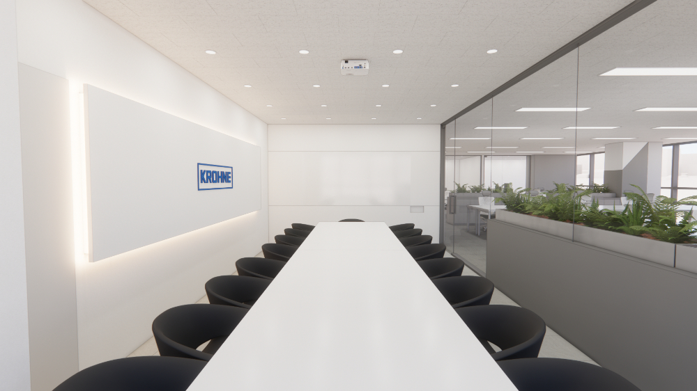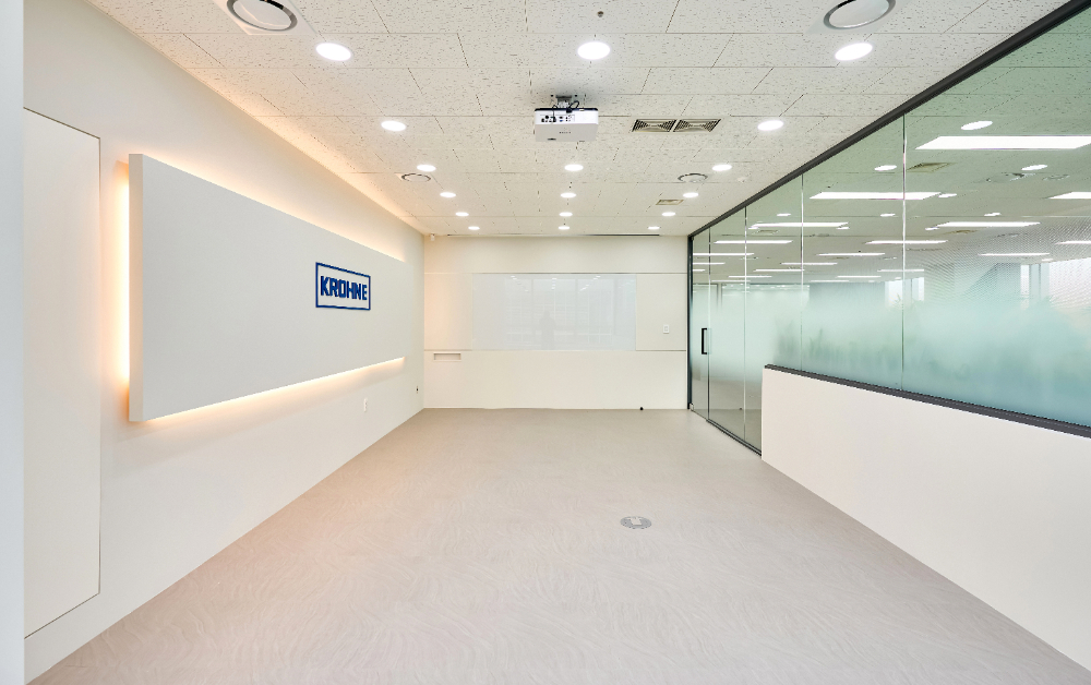 대형 회의실에서 눈여겨 볼 점이라면 아무래도 아트월인데요. 입체적으로 만들어진 아트월의 뒷편에는 조명이 매립되어 있습니다. 그래서 한번더 눈길이 가기 마련이고, 바깥에서 보았던 아트월과는 색이 반전되는 느낌인데요. 이곳은 화이트월에 파란색 로고를 삽입해 특징을 주었습니다.