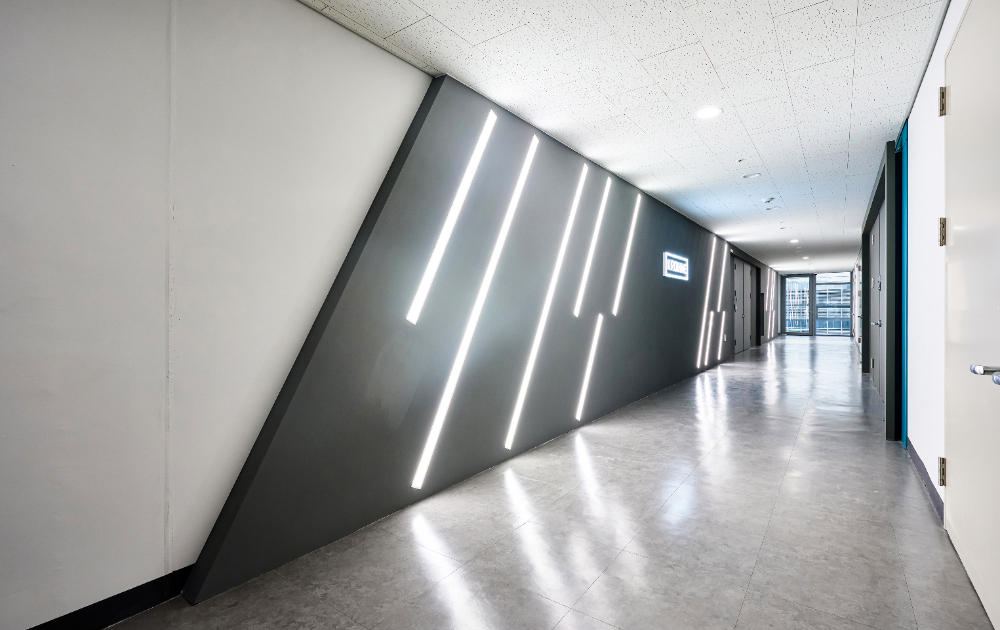 외관 파사드부터 시작하겠습니다. 블랙의 진한 바탕에 라인 조명을 사선으로 곳곳에 집어넣은 형태는 현대적이면서도 세련된 멋을 연출합니다. 그리고 해당 분위기에 걸맞게 네온사인 느낌이 가득한 로고를 부착하였는데요. 복도 전체의 그레이톤과도 조화를 어울리는 모습을 보실 수 있습니다.