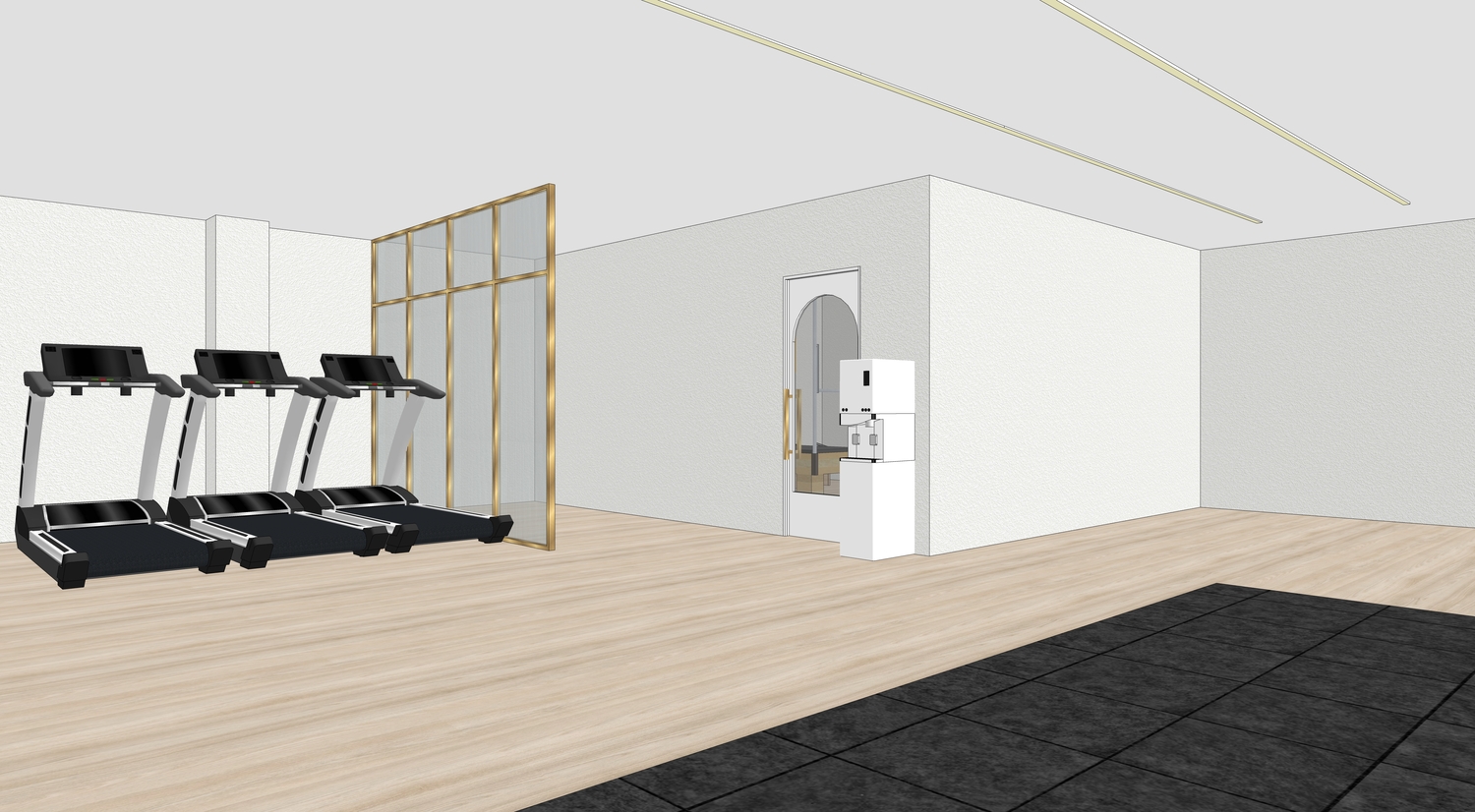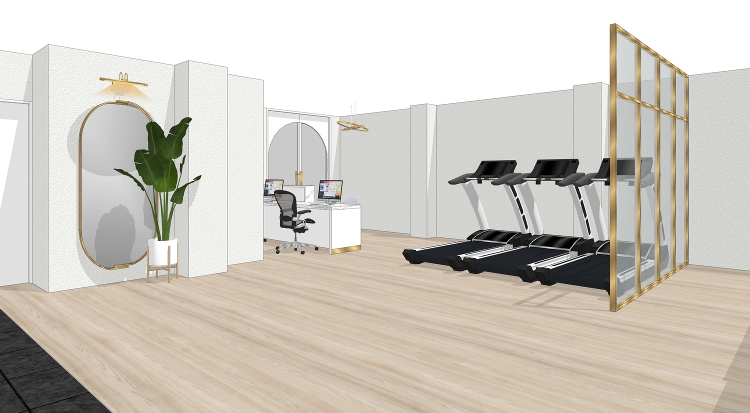 그리고 체형을 분석하고 회원들이 각자의 목표를 수립하고 나아갈 수 있는 공간이 별도로 필요했는데요. 꽉 막힌 가벽으로 공간을 분리하기에는 답답함이 커질 수 있어 골드 프레임의 유리 가벽으로 답답하지 않으면서도 공간이 분리되는 효과를 주었습니다.