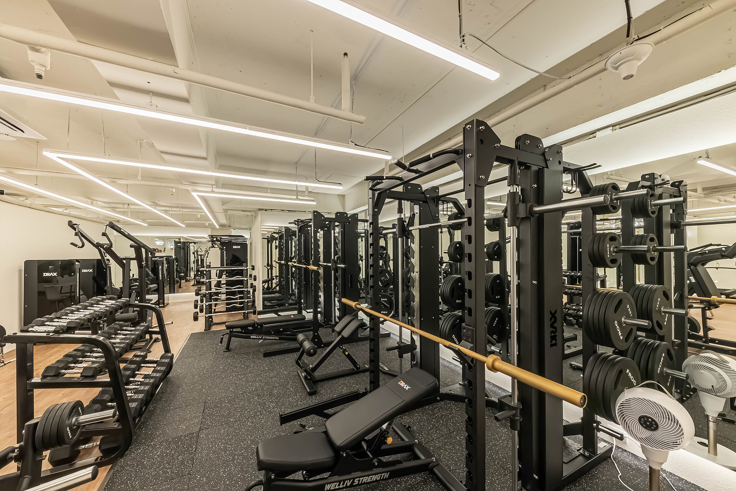 거울 바로 앞의 근력운동을 하는 곳은 탄성매트시공은 물론 천장에 라인 조명이 촘촘하게 되어 있어 시야를 밝혀줍니다. 그리고 조명이 밝은만큼 자신의 바디를 잘 파악할 수 있어 눈바디체크도 용이하다는 장점이 있습니다.