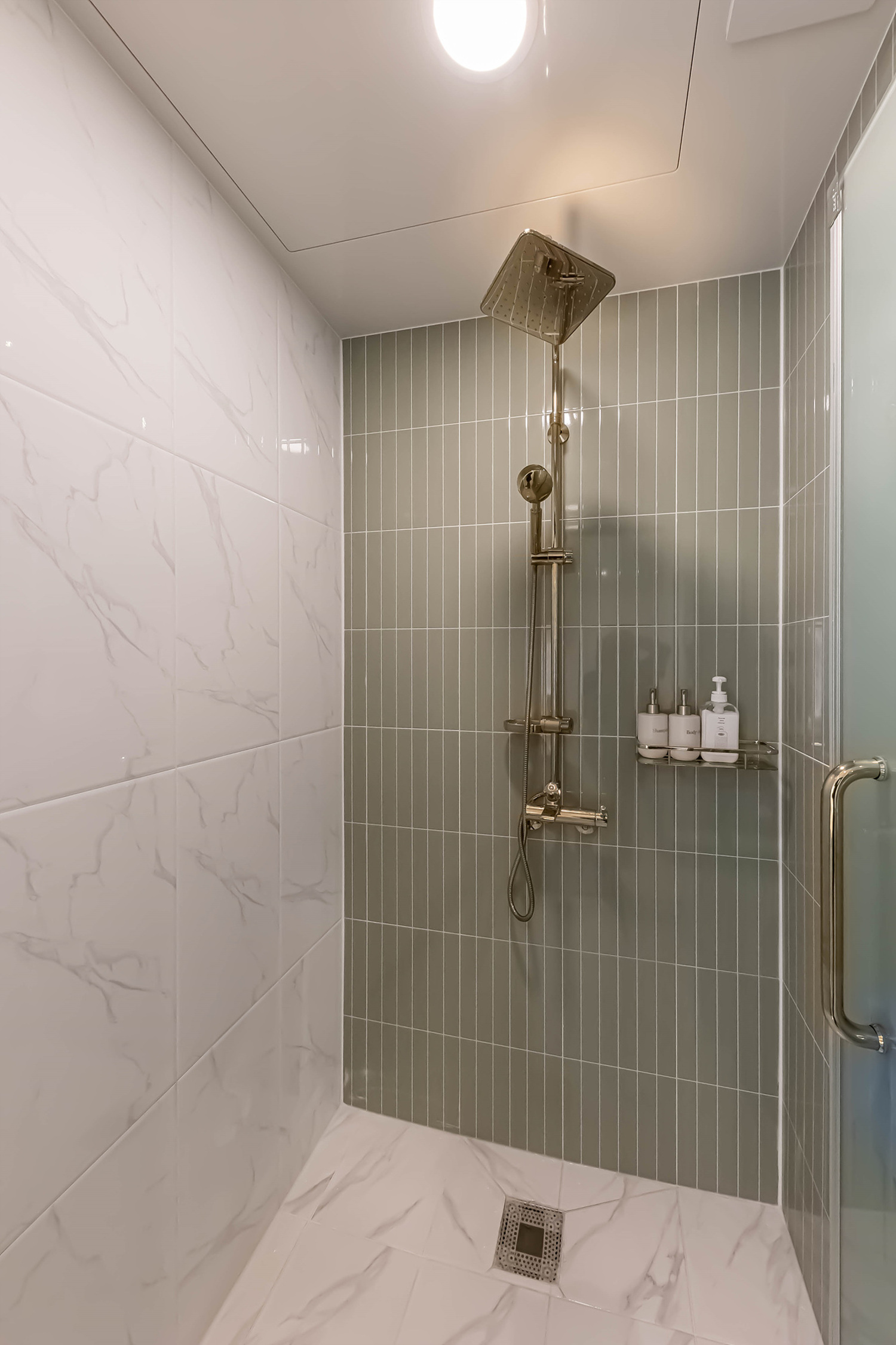 샤워실은 남자와 여자 모두 프라이빗하게 만들어져 있으며 타일의 색상에 차이를 두어 매력포인트를 만들었는데요. 파스텔톤의 핑크와 그린 색상이 화사함을 살려주고 세로로 긴 타일이 고급스러움을 선사합니다.