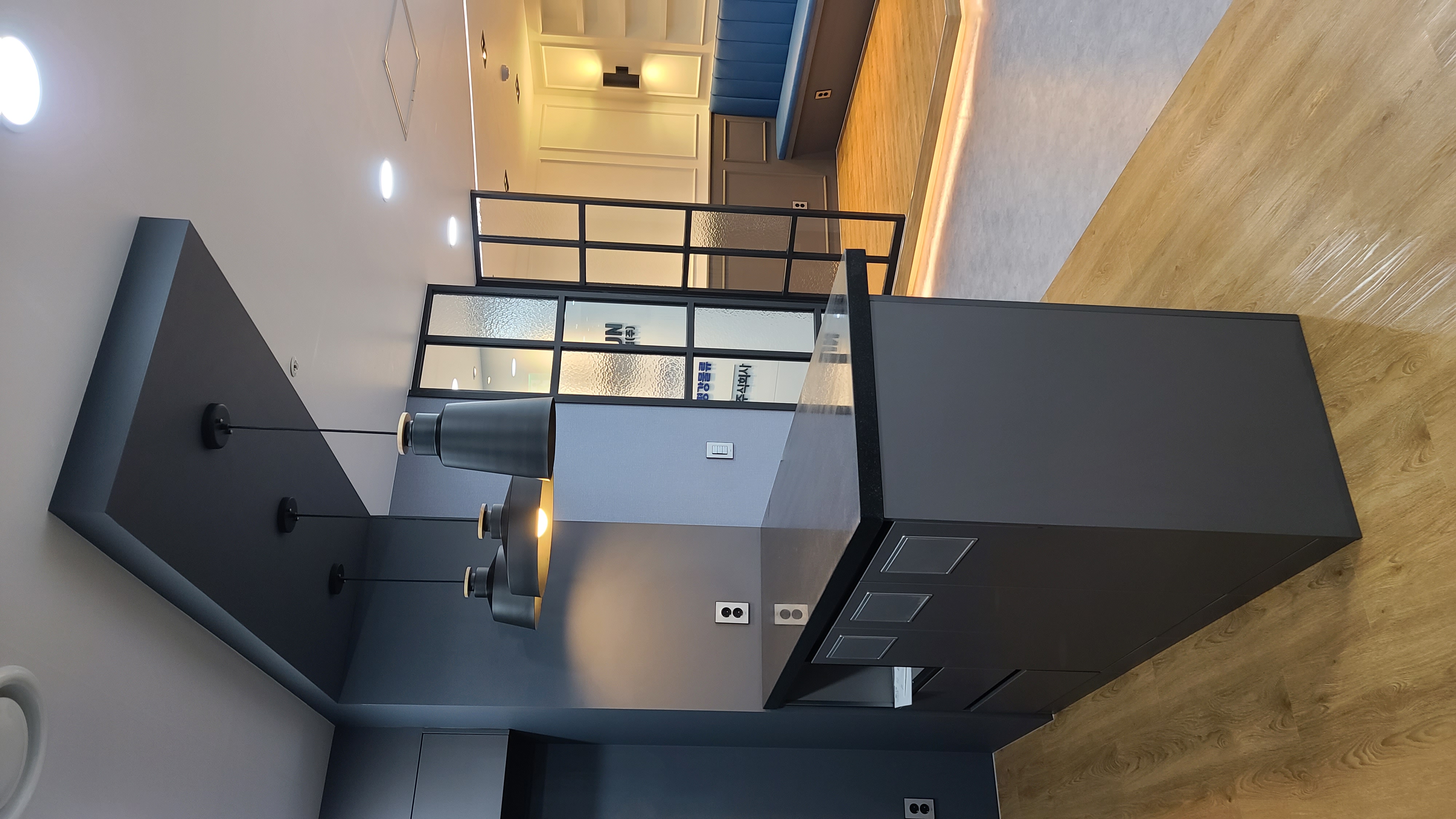 안녕하세요 916디자인입니다. 사무실인테리어에대해 오늘 소개해드리려고합니다. 사무실의 입구입니다. 사무실입구는 블랙색상으로 깔끔하게 구성하였습니다. 인포부분에는 목공으로 루바패��