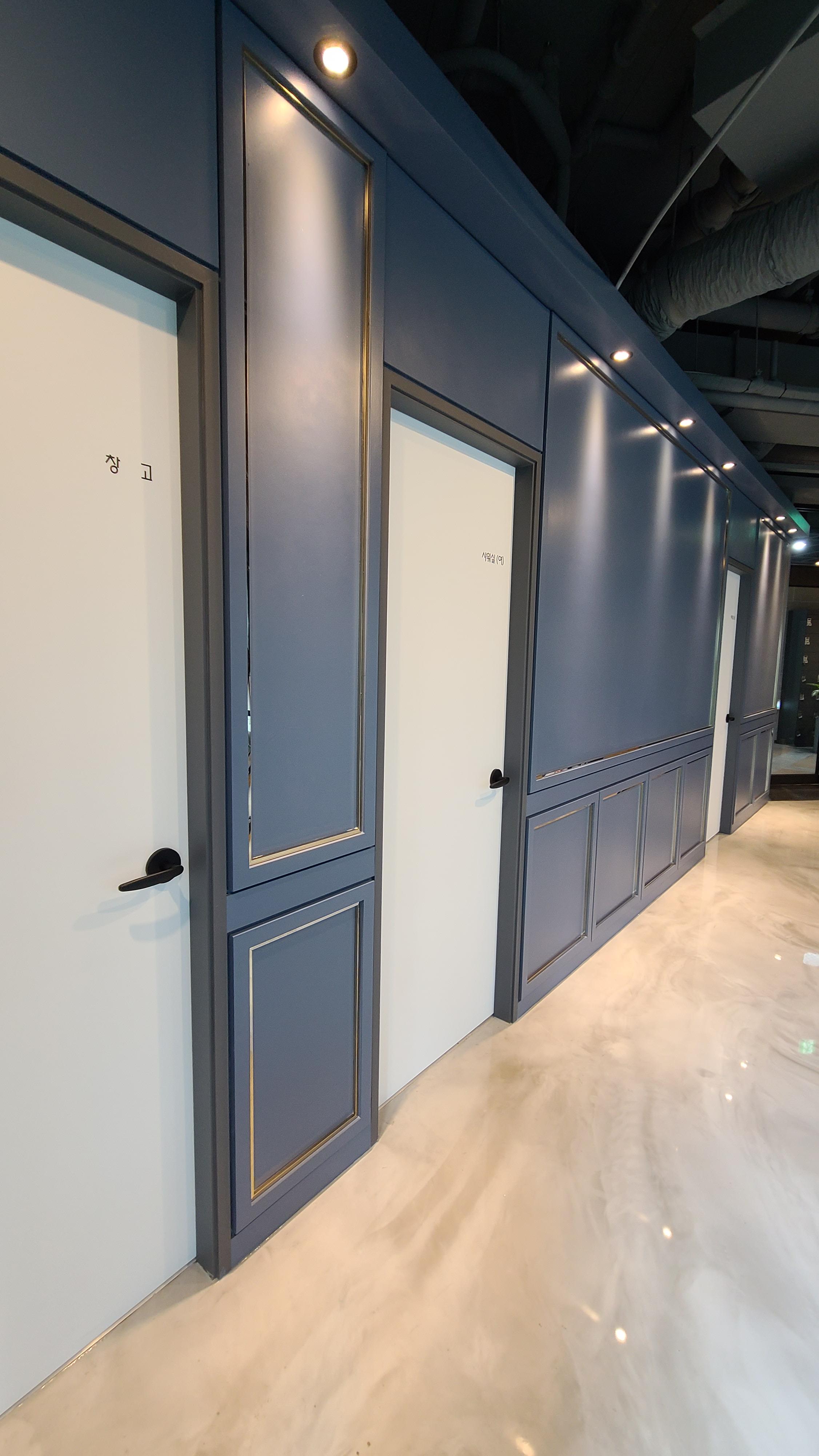 앞서 보셨지만 각 공간으로 들어가는 문은 화이트 도어로 깔끔하게 진행하였으며 손잡이는 블랙 컬러를 넣어 포인트를 주었습니다. 벽면을 비추는 간접등이 공간을 매력적이게 만들어 주고 있습니다.