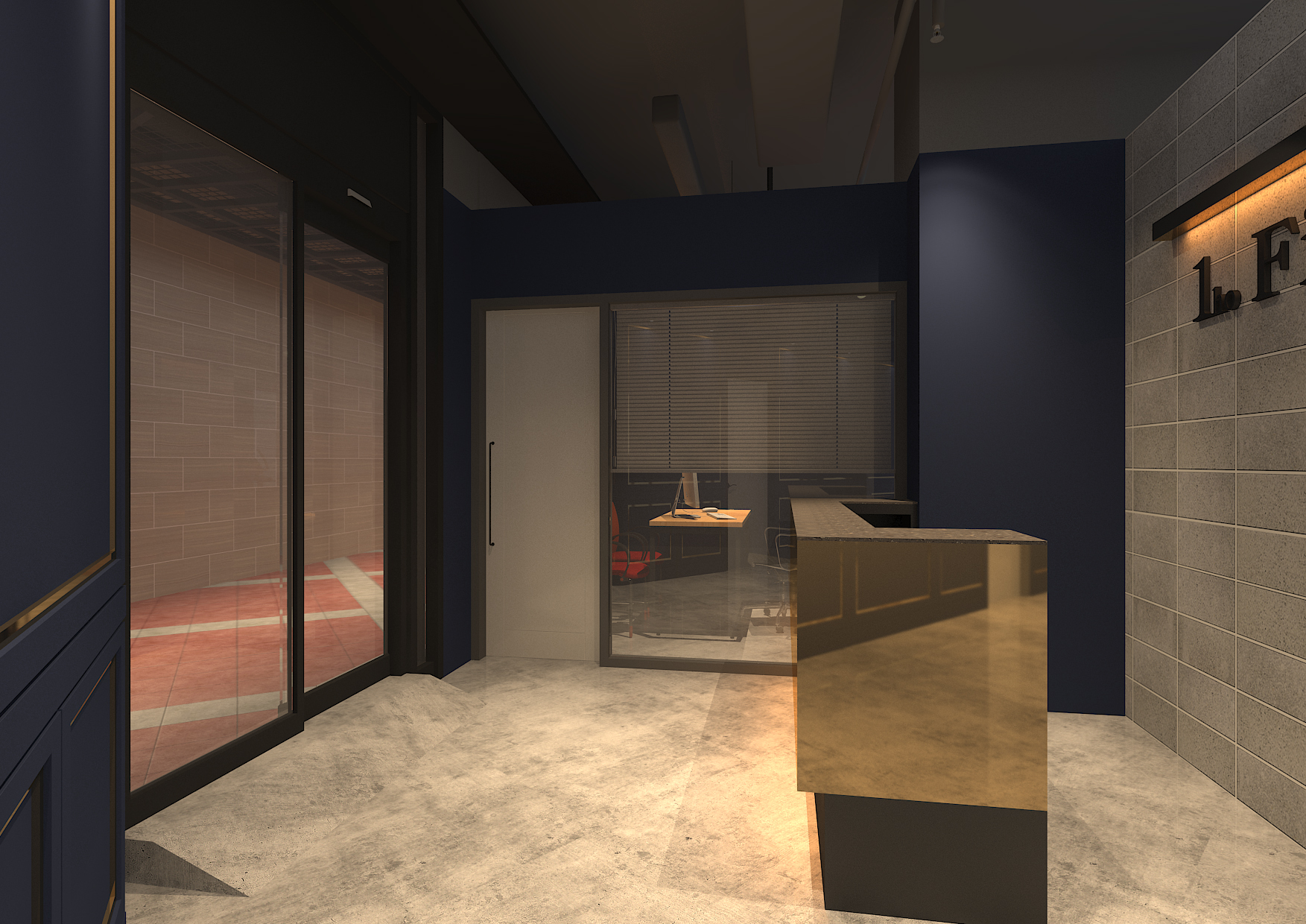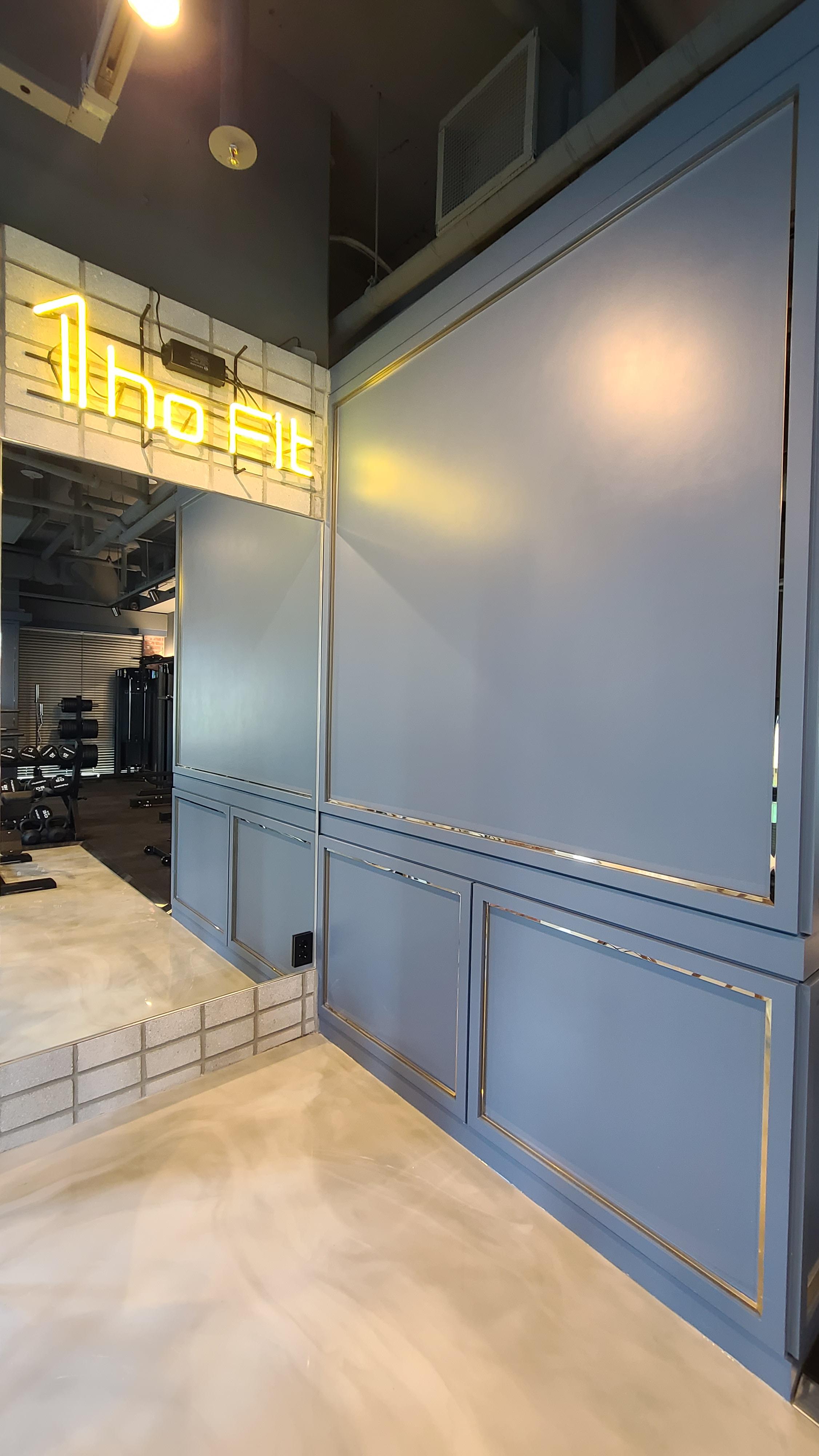 매장 입구에 들어서면 가장 먼저 보이는 공간입니다. 헬스장 네이밍이 잘 보이도록 윗부분에 간접조명을 두어 포인트를 주었습니다. 바닥은 대리석 느낌의 패턴 타일을 깔았으며 고급스러운 느낌이 들 수 있도록 골드와 그레이를 섞어 표현하였습니다.