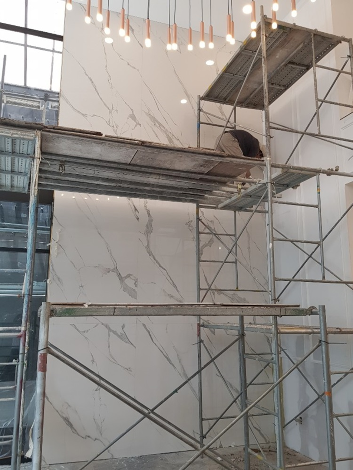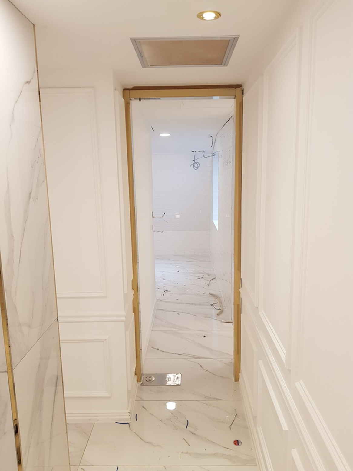공간의 분위기를 통일하기 위해 마블링 타일을 통일감있게 바닥에 깔아주고,