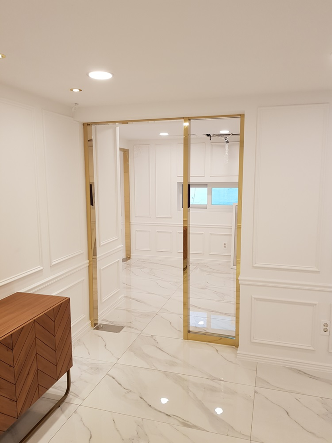 이번 빌딩리모델링에서는 고급스럽고 세련된 디자인을 적용하기 위해 골드 포인트를 적극적으로 사용하여 공간을 새롭게 연출하였습니다. 문틀 골드 도금 뿐만 아니라 의자 등 골드 라인을 적용하여 이미지를 업그레이드시켜 고급스러움을 극대화하였습니다.