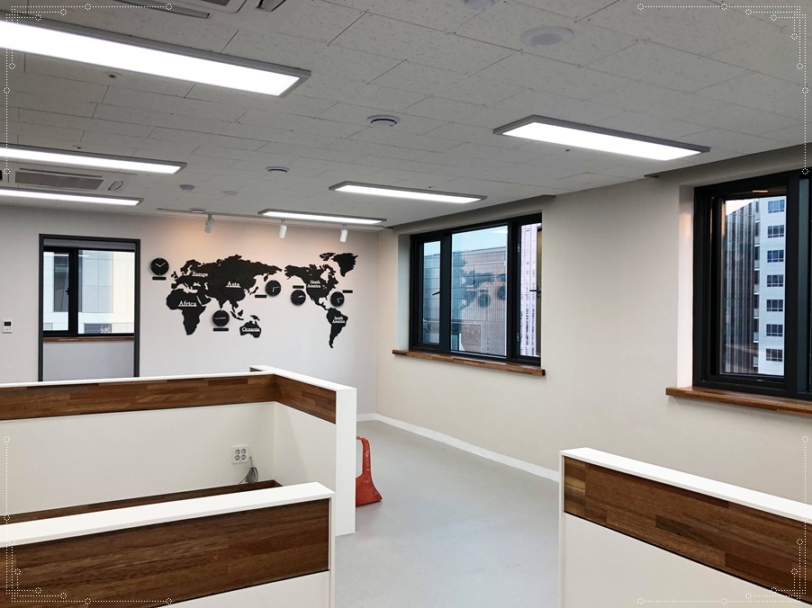 사무실 벽면에는 무역회사에 꼭 필요한 세계 지도를 고무로 제작해 부착하고 현시 시각을 알 수 있는 시계도 함께 시공해 편의성을 높였습니다. 현지와 통화할 일이 있다면 일일이 스마트폰으로 세계시각을 알아보지 않아도 되겠죠?