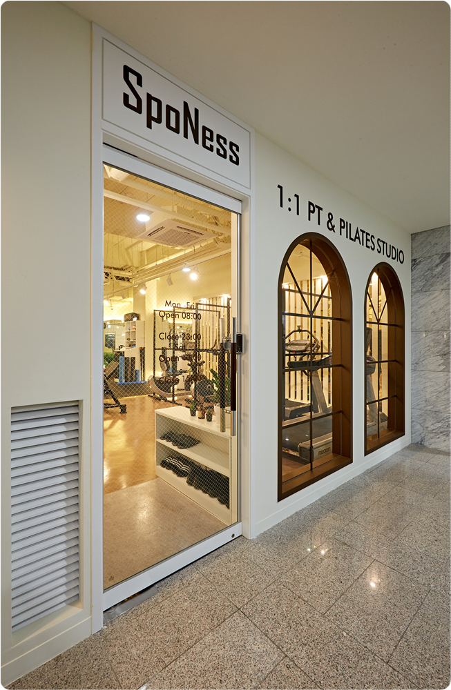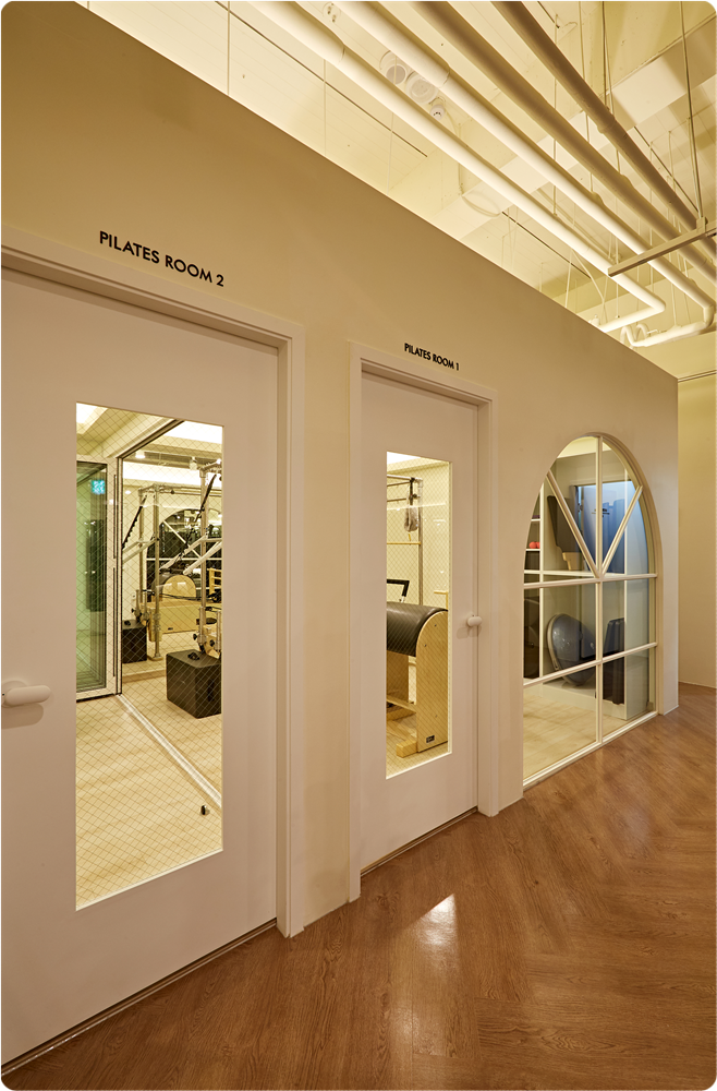필라테스 프로그램을 운영하는 공간은 가벽을 세워 공간을 분리했는데요, 천장 끝까기 막지 않음으로써 냉난방, 조도, 스피커 시설 등을 공유할 수 있도록 했습니다. 거울을 시공해 공간이 넓어 보이도록 했고 동시에 정확한 자세와 몸의 상태를 확인할 수 있도록 했으며 벽면에 수납 시설을 시공해 좁은 공간을 효율적으로 활용할 수 있도록 했습니다.