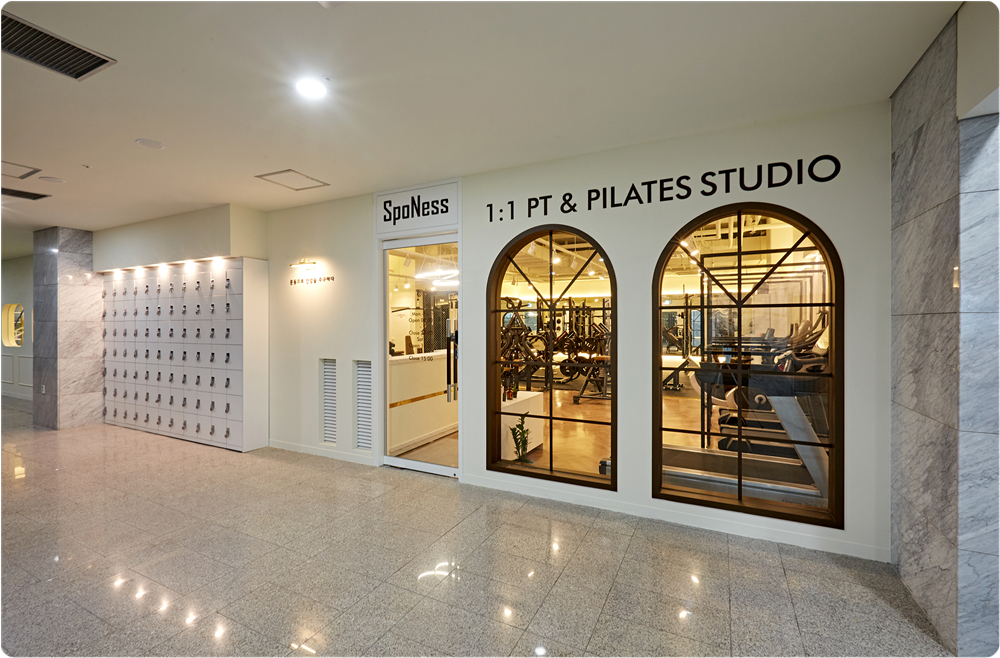 이 곳은 헬스장과 필라테스가 함께 운영되고 있는 PT샵이어서 활동 영역이 크고 역동적인 헬스 기구는 오픈형 공간에 배치하고 조용한 분위기에서 차분하게 운동하는 필라테스는 공간을 분리해 독립적으로 배치했습니다. 헬스장은 프리웨이트존, 머신존, 유산소존으로 구분해 기구를 배치했고 프리웨이팅존에는 거울과 바닥매트를 설치해 운동 능률과 효과를 높일 수 있도록 했습니다.