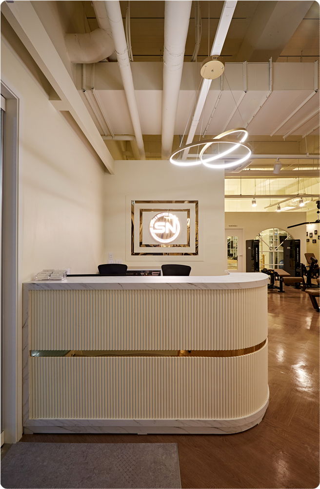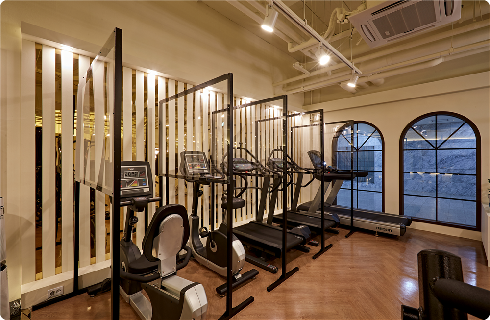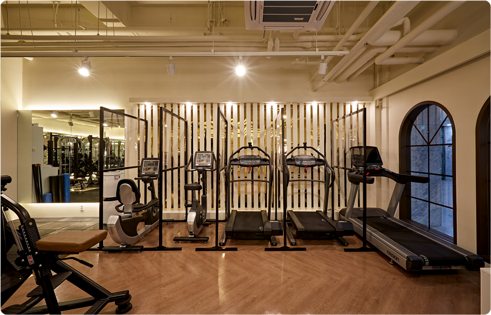 조명은 적당한 조도로 밝고 활기찬 느낌을 주어 역동적인 운동 공간의 분위기를 조성하려고 했습니다. 특히, 회원을 맞이하고 배웅하는 카운터 공간은 템바보드를 적용한 테이블을 시공해 아기자기하면서 부드러운 느낌을 주면서 골드 컬러의 금속 소재를 적용해 고급스러움을 포인트로 줬습니다.
