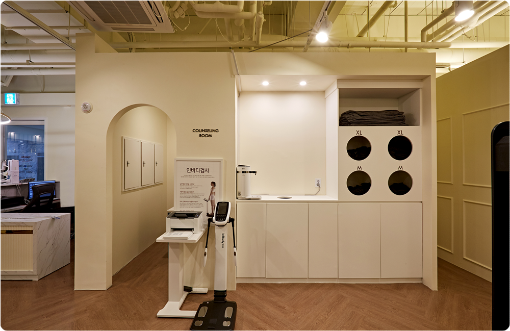 인포테이블이 있는 로비공간을 지나 탈의실로 진입하는 동선에는 인바디 검사를 하고 이를 상담받을 수 있는 카운셀링 룸이 있고 갈아입을 운동복이 비치돼있는 옷장이 있어 편리하게 사용할 수 있습니다.