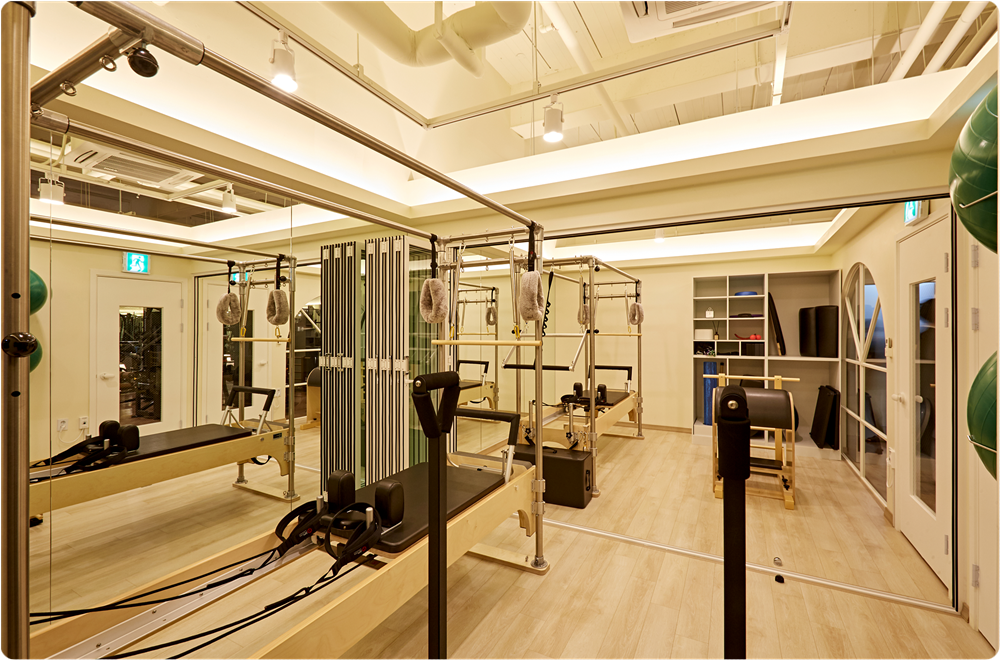 필라테스 프로그램을 운영하는 공간은 가벽을 세워 공간을 분리했는데요, 천장 끝까기 막지 않음으로써 냉난방, 조도, 스피커 시설 등을 공유할 수 있도록 했습니다. 거울을 시공해 공간이 넓어 보이도록 했고 동시에 정확한 자세와 몸의 상태를 확인할 수 있도록 했으며 벽면에 수납 시설을 시공해 좁은 공간을 효율적으로 활용할 수 있도록 했습니다.