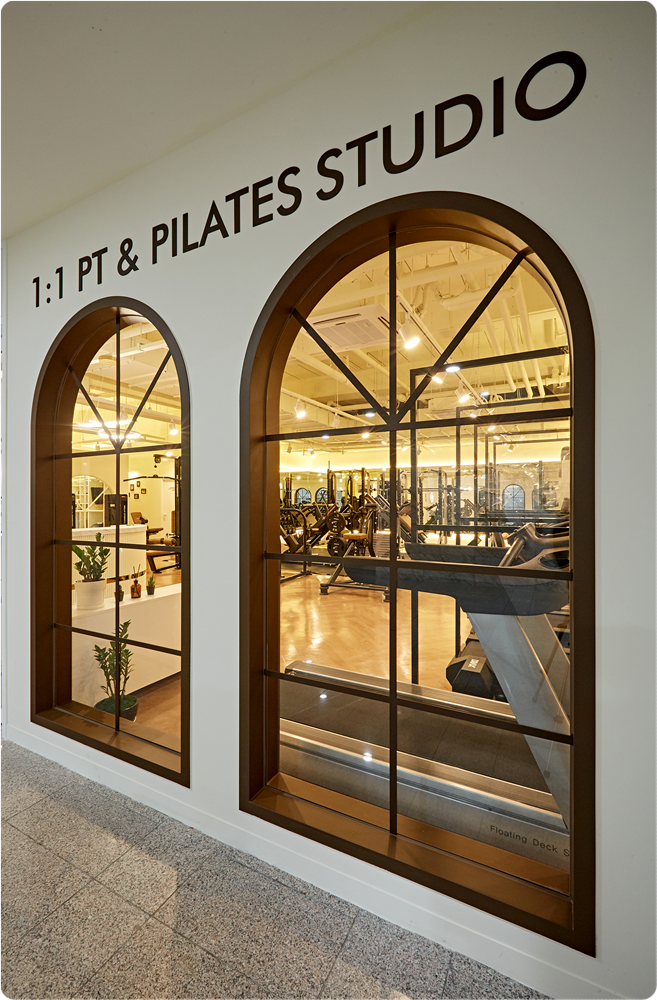 이 곳은 헬스장과 필라테스가 함께 운영되고 있는 PT샵이어서 활동 영역이 크고 역동적인 헬스 기구는 오픈형 공간에 배치하고 조용한 분위기에서 차분하게 운동하는 필라테스는 공간을 분리해 독립적으로 배치했습니다. 헬스장은 프리웨이트존, 머신존, 유산소존으로 구분해 기구를 배치했고 프리웨이팅존에는 거울과 바닥매트를 설치해 운동 능률과 효과를 높일 수 있도록 했습니다.