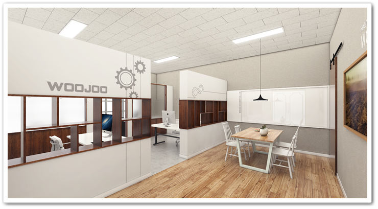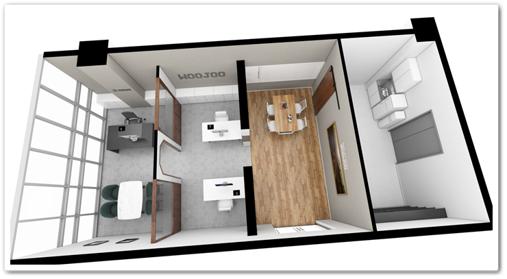 먼저 3D 구성 도안에 대해서 설명을 해드리도록 하겠습니다. 좁아보이는 사무실을 공간을 활용하여 4개의 부서로 나누었고 업무 공간을 효율적으로 살리는 것과 동시에 서비스 공간과 고객과의 상담 공간까지 한 번에 살려서 디자인 구성을 해보았습니다. 전체적인 사무실의 분위기가 통일이 된 듯 부서마다 각기의 색깔을 담아서 구성해보았으며 소개를 드릴때 이를 참고하시는 것을 추천드립니다.
