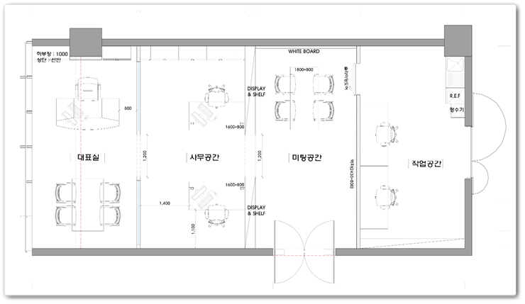 사무공간과 미팅공간의 사이에는 독특하게도 네모나 구멍을 뚫어서 서로의 모습을 볼 수 있도록 공간을 나눠보았는데 사무실같은 경우에서는 업무를 보다가 한 번씩 미팅공간을 쳐다볼 수 있도록 만들어서 피로감을 조금이나마 감소시키는 효과를 얻게 만들었으며 미팅공간에서는 미팅관련 상담을 하거나 휴식을 취하더라도 업무의 효율을 떨어뜨리지 않고 과한 휴식을 하지 않도록 조화를 주어서 분리를 해보았습니다.