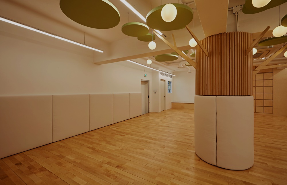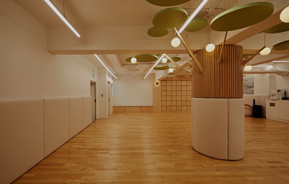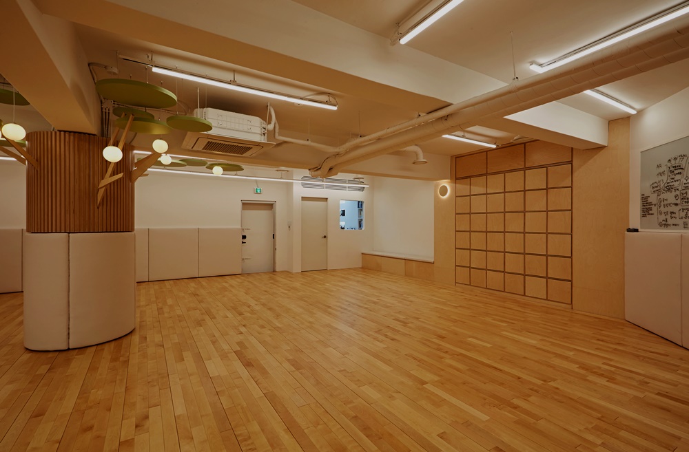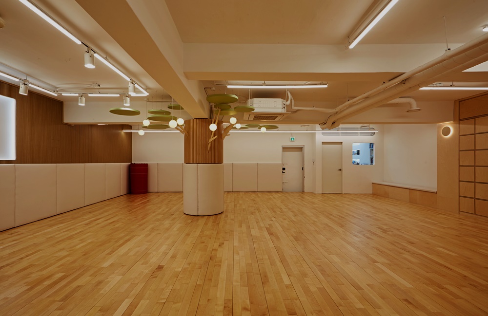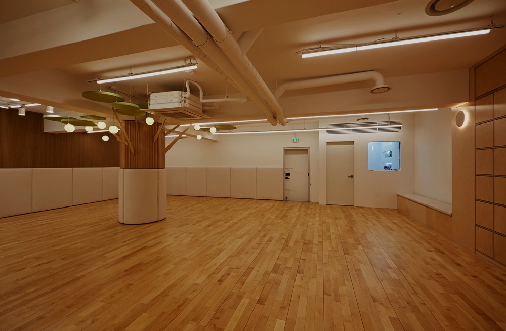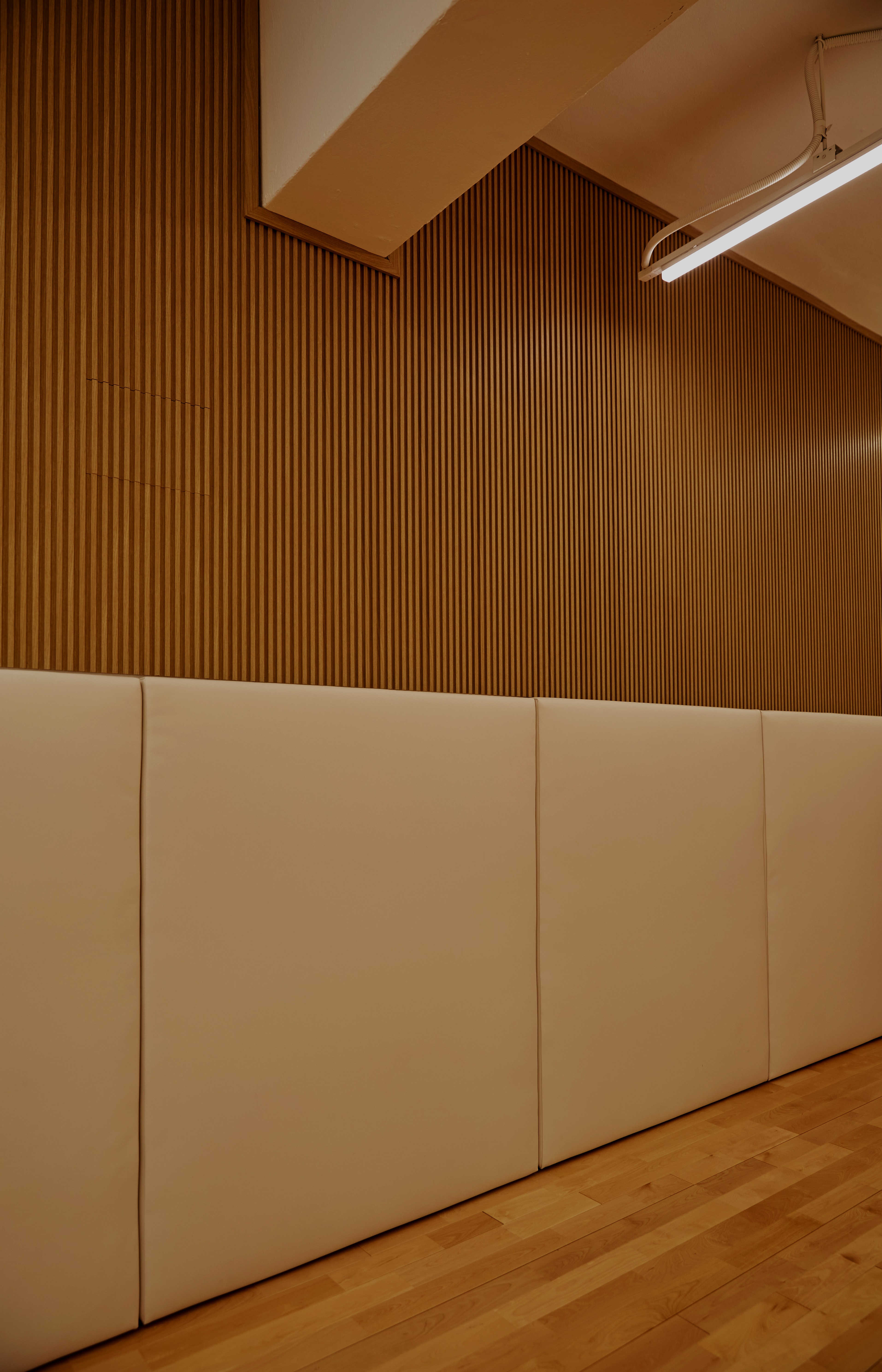 바닥은 밝고 부드러운 우드톤 마감재를 중심으로 계획해 차분한 인상을 주었고 벽면은 패딩 처리와 우드 패널을 조합해 충격 완화와 심미성을 동시에 확보했어요.