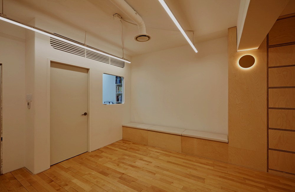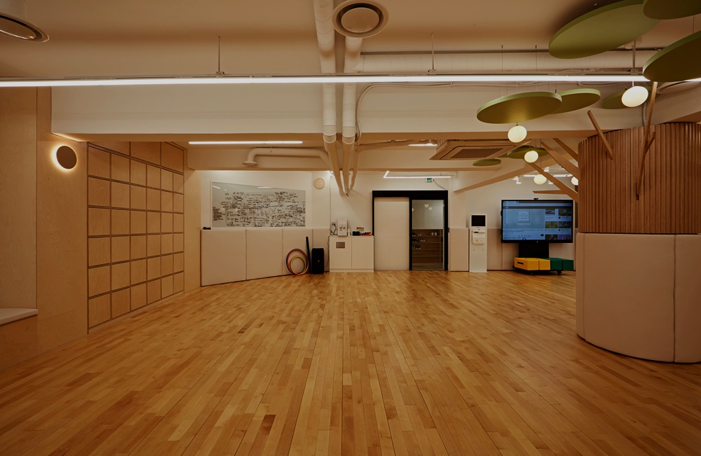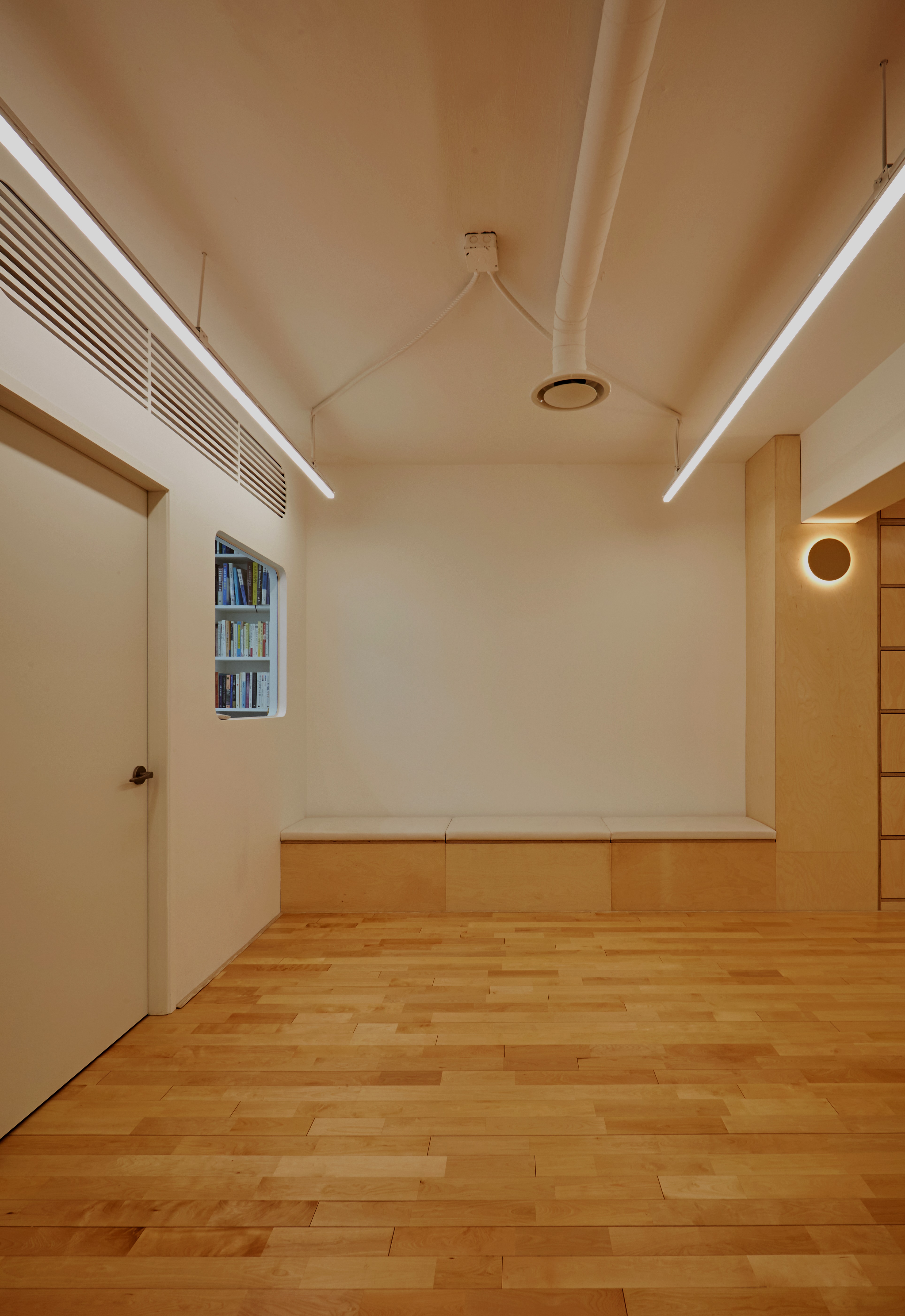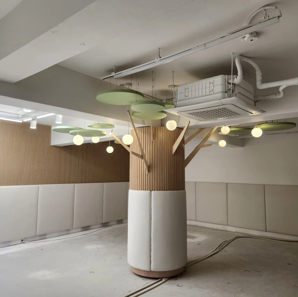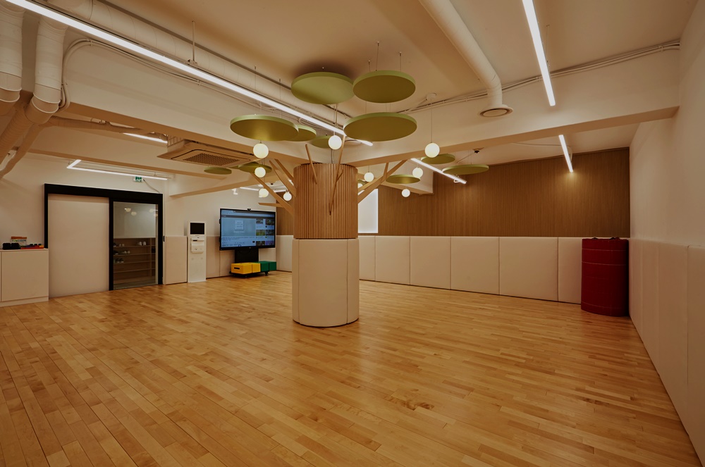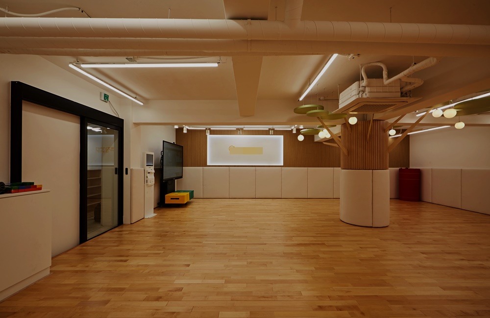 바닥은 밝고 부드러운 우드톤 마감재를 중심으로 계획해 차분한 인상을 주었고 벽면은 패딩 처리와 우드 패널을 조합해 충격 완화와 심미성을 동시에 확보했어요.