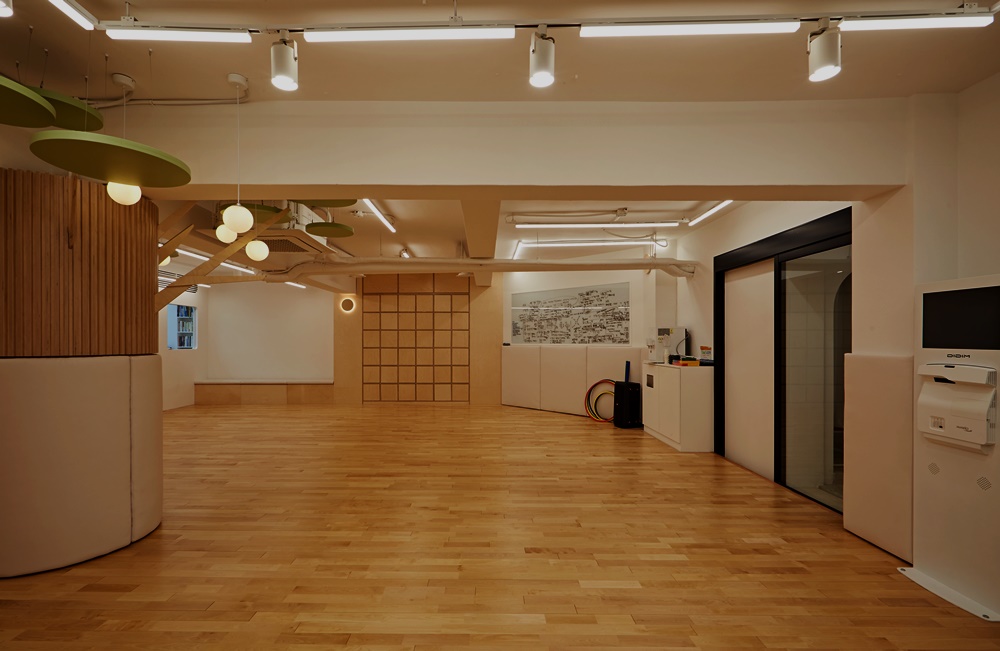천장은 노출된 배관과 구조물을 정돈해 현대적인 감각을 살렸고 원형 조명과 직선형 조명을 적절히 배치해 공간에 리듬감을 더했어요.