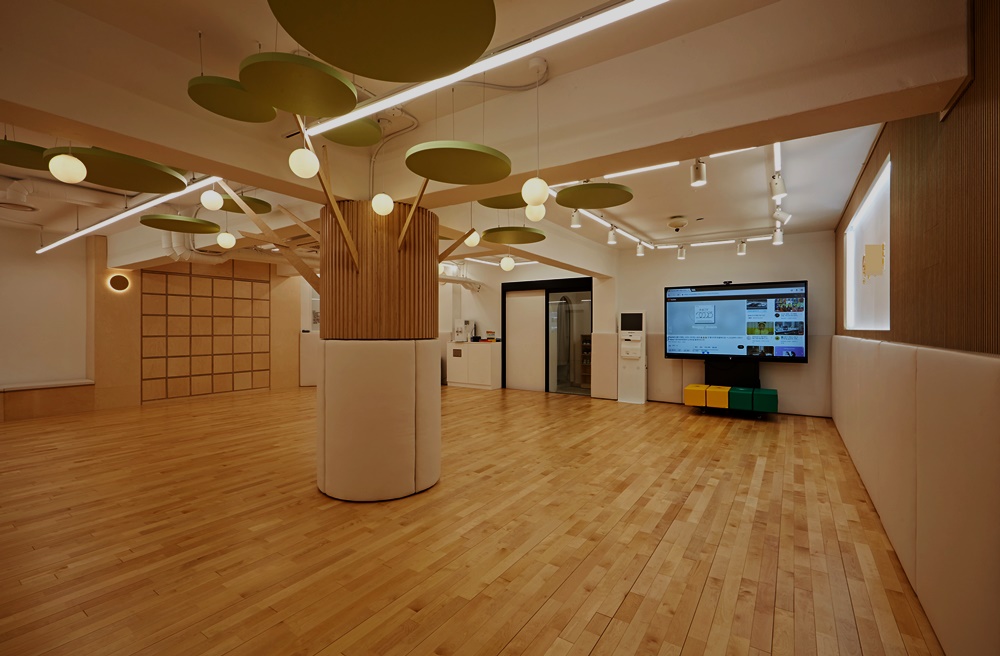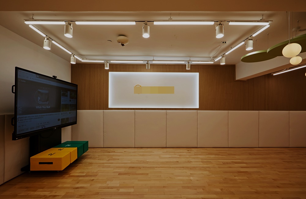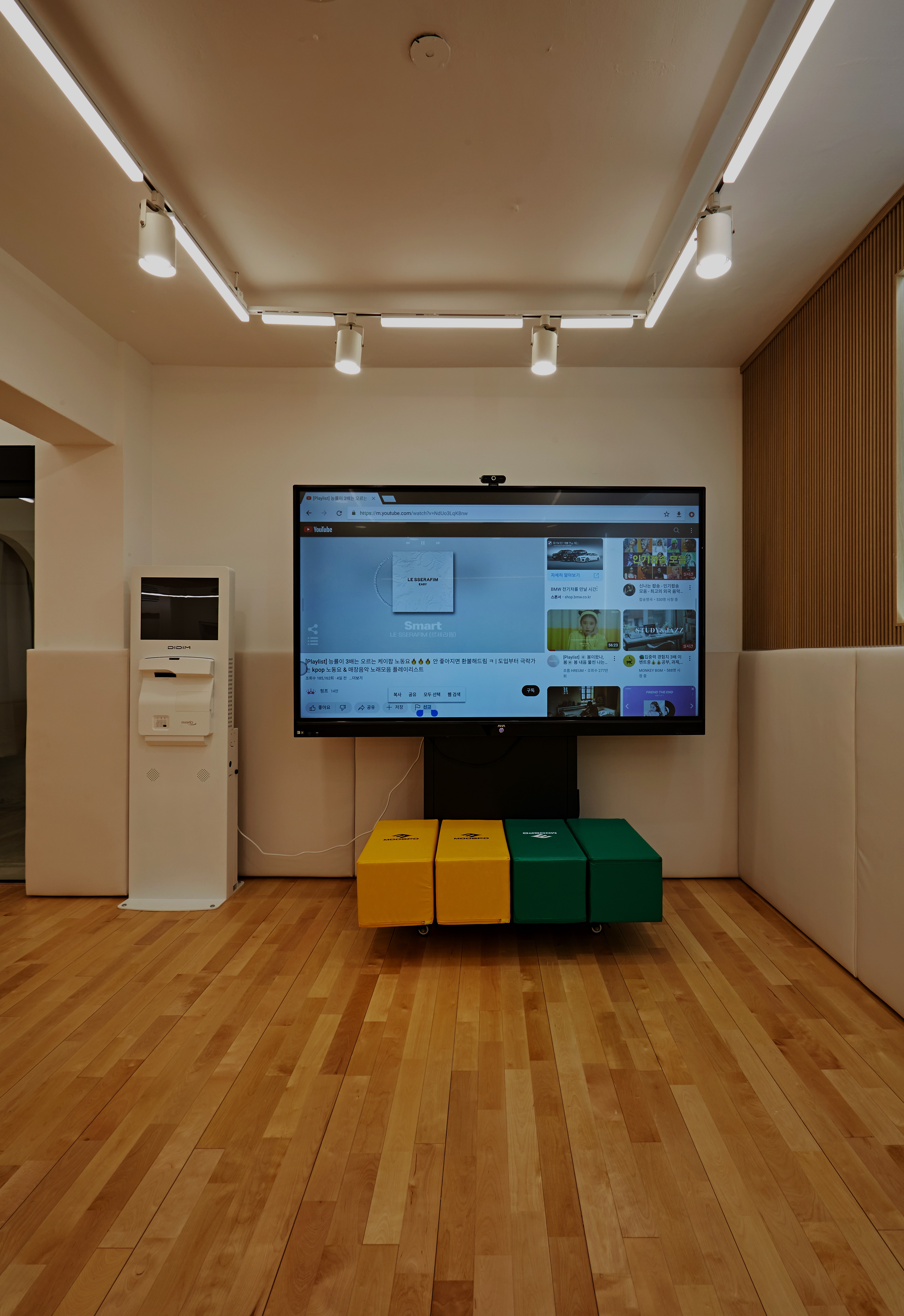 공간 한쪽 벽면에는 TV 화면과 더불어 바퀴가 달린 형형색색의 모듈형 쿠션 의자가 있어 필요에 따라 자유롭게 좌석 배치를 조절할 수 있어 활용성을 높였는데요.