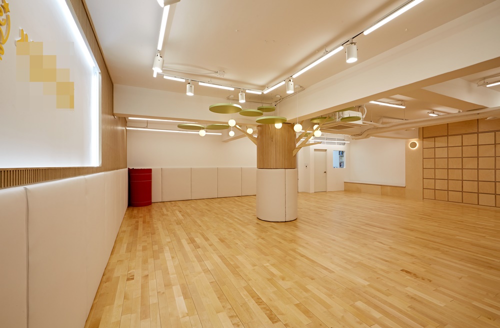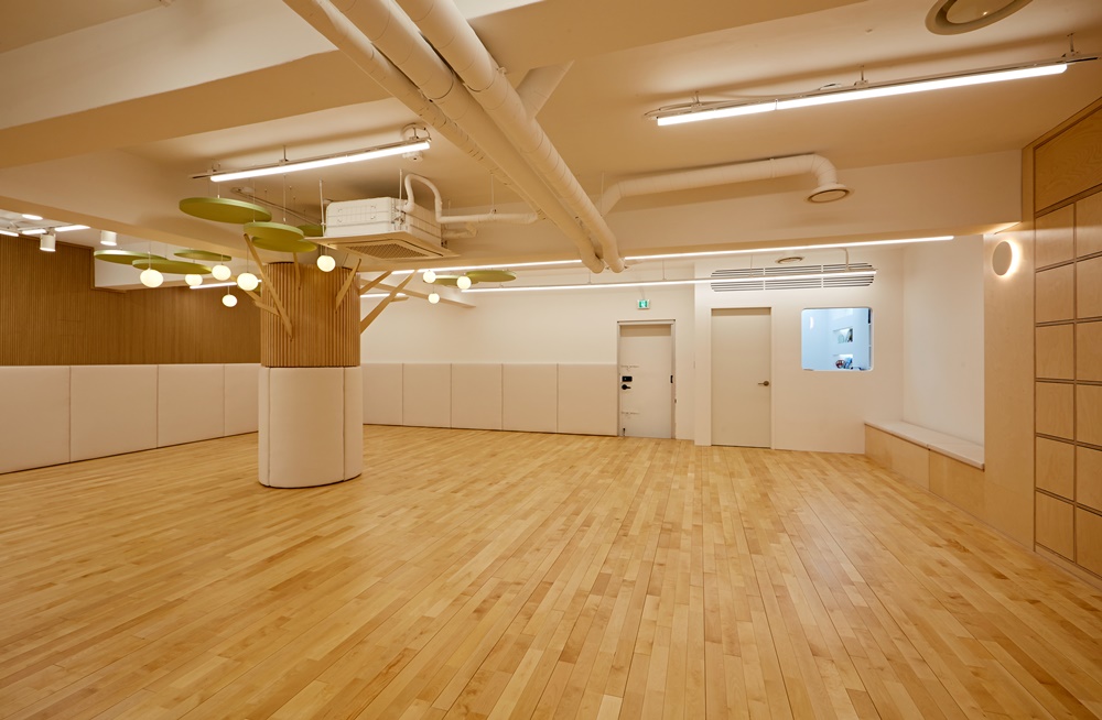 바닥은 미끄럼 방지 처리가 된 원목 마루를 사용했고 모서리에는 충격 완화를 위한 코너 패드를 부착했습니다.