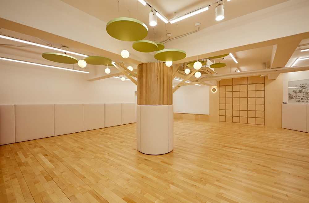 노출 천장 구조를 유지하되, 공조 덕트와 조명 라인을 깔끔하게 정리하고 그 위로는 나무와 잎사귀를 형상화한 구조물을 설치해