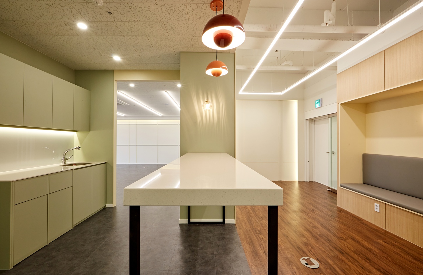 회의 테이블이나 라운지 의자를 오픈 스페이스에 배치하는 것도 좋은 방법입니다.