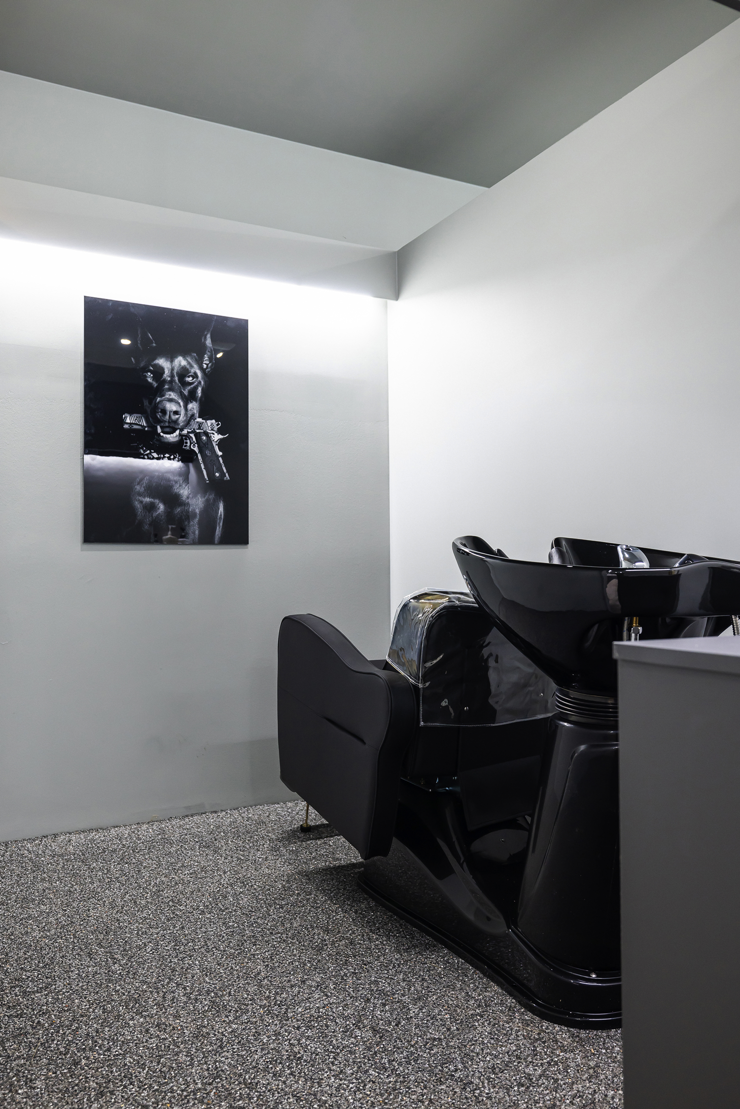 샴푸실은 고객이 가장 편안함을 느껴야 하는 공간이기에 블랙톤의 샴푸 의자를 배치하여 안정감을 극대화했습니다.