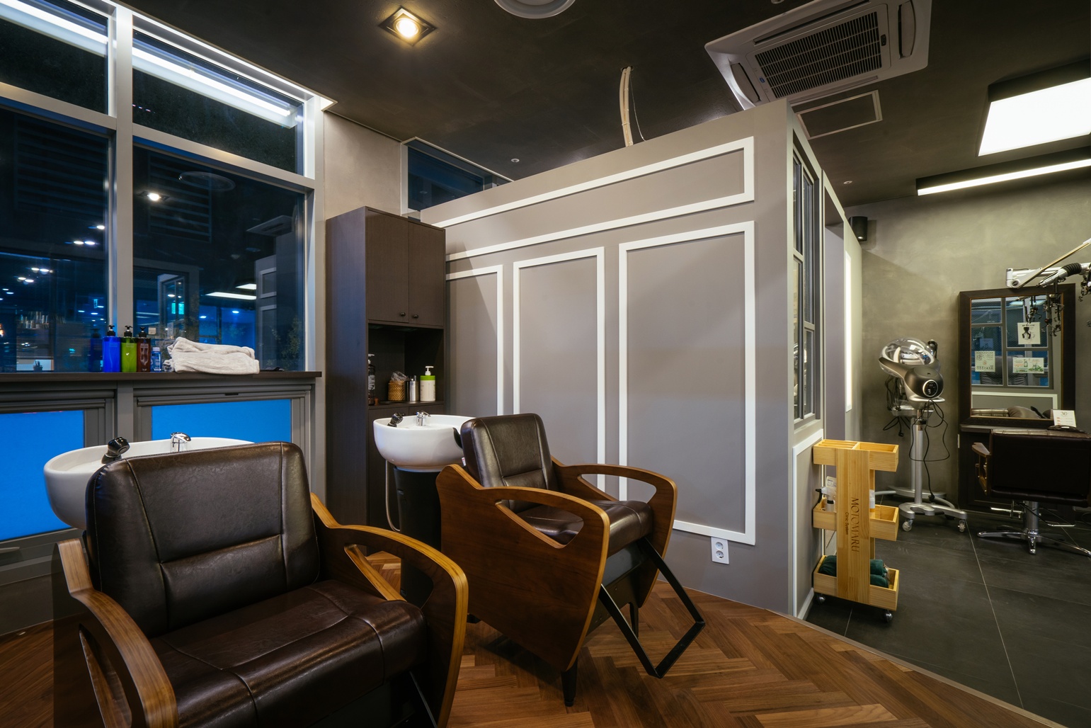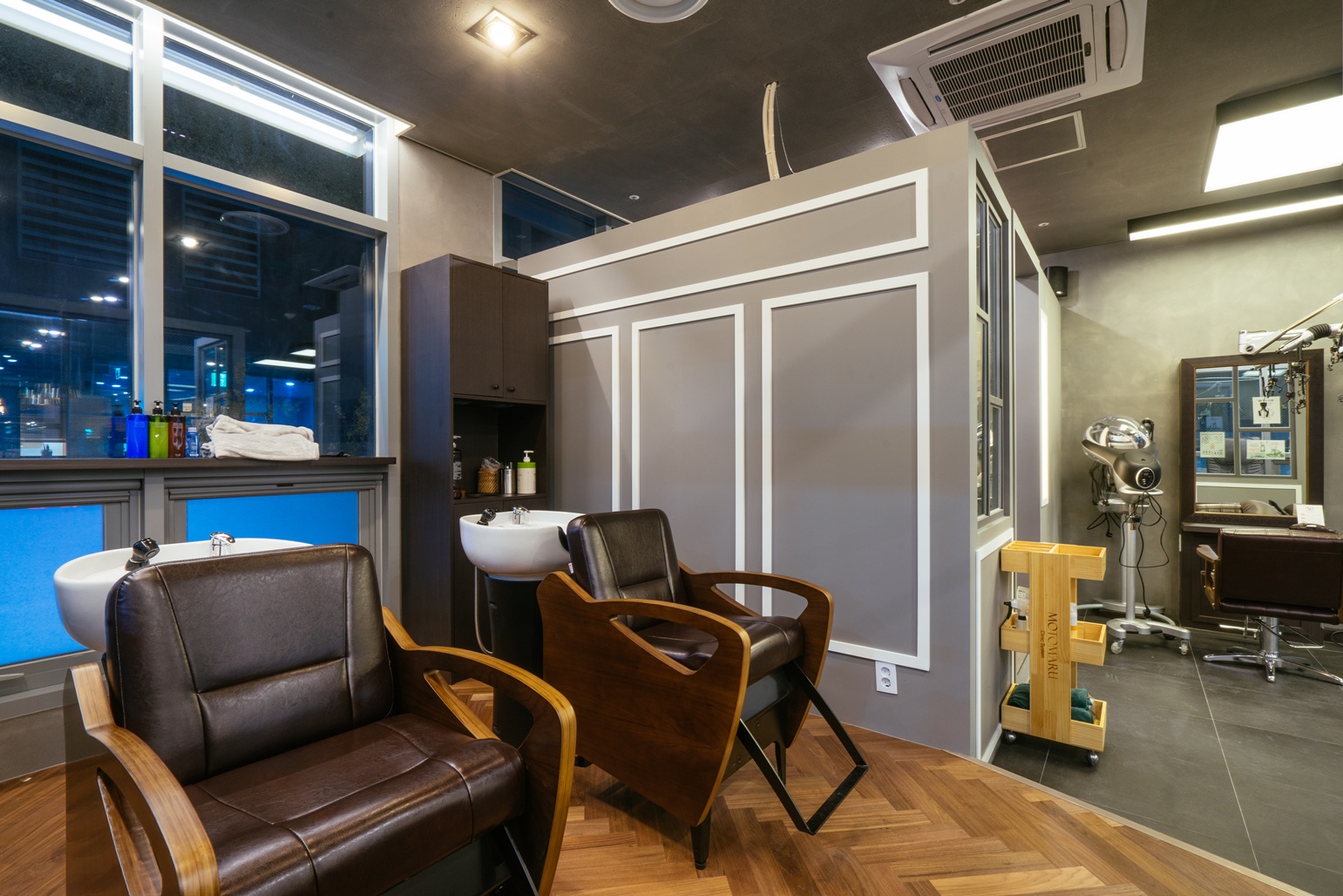 미용실은 우드톤을 사용하여 따뜻하고 아늑한 분위기를 연출했으며,