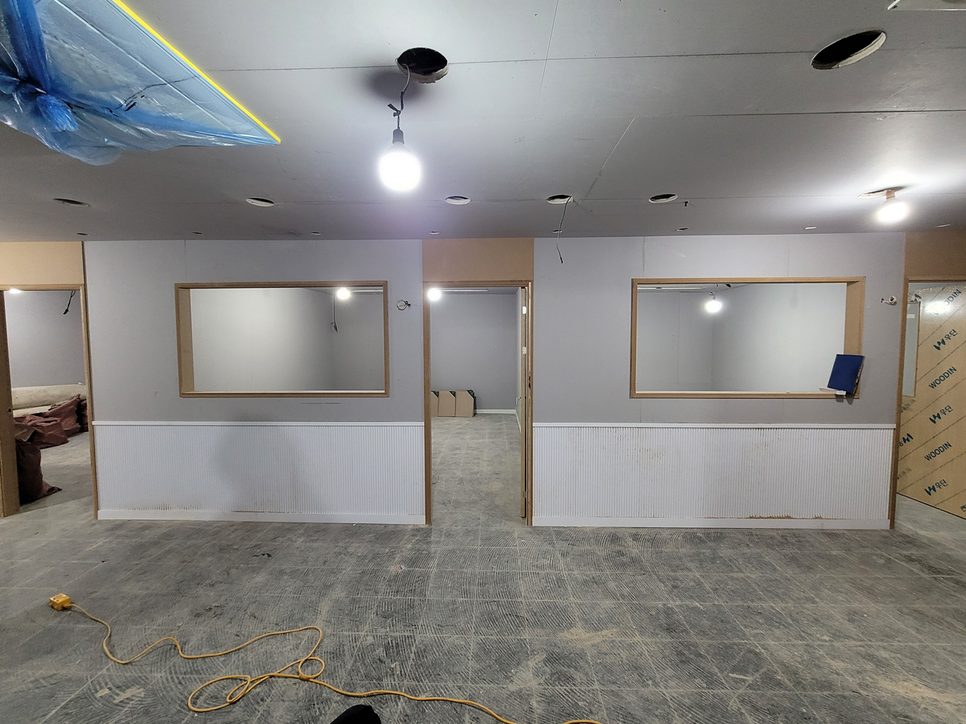 가벽 시공과 간살 파티션 제작이 중심이 된 목공 공정입니다.