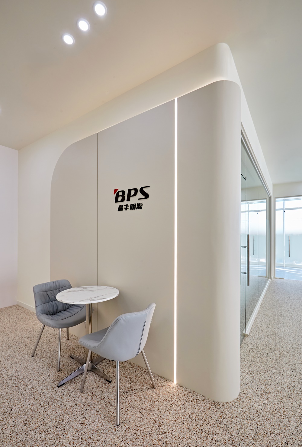 회의실 벽면, 라운지 공간, 파티션 모서리까지 곡선을 적용해 직선 구조와 대비되도록 연출했으며 이를 통해 공간이 한층 유연하고 부드럽게 느껴지도록 했죠.