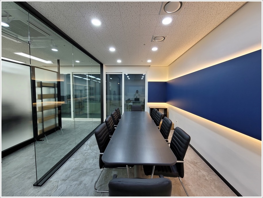 유리 가벽으로 공간을 독립적으로 구분한 회의실입니다. 내부 벽면에는 차분한듯 하면서 경쾌하고 자신감있는 딥블루를 디자인해 입구 파사드와 인테리어적 통일성을 주었고 가로로 길게 디자인하고 간접 조명을 시공해 공간이 더욱 길고 넓어 보이는 효과를 주었으며 차가울 수 있는 딥블루에 따뜻한 색의 조명을 적용해 고급스럽고 아늑한 분위기를 연출했습니다.