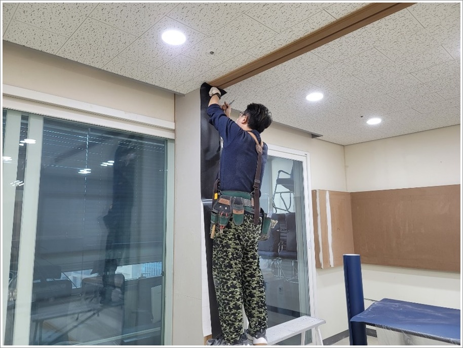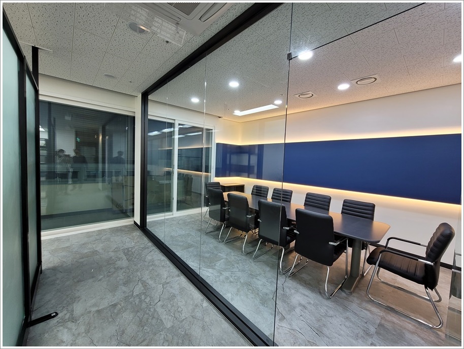 유리 가벽을 세우기 위해 프레임을 작업한 후 필름지로 마감을 한 회의실 모습입니다. 유리만 적용했을 때 약간 밋밋할 수 있는 디자인에 블랙 프레임을 더해 세련되고 깔끔한 분위기를 조성했습니다.