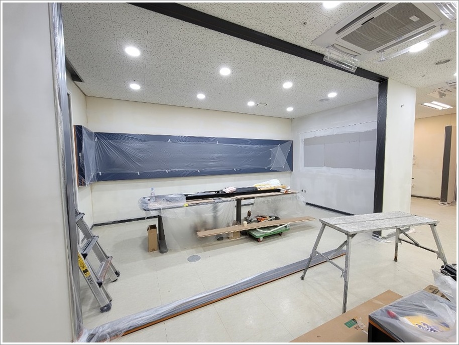 입구 파사드 공사 진행 모습입니다. 모양을 잡고 디자인에 따라 치장을 하는 목공 작업이 끝나고 필름 작업을 위해 프라이머 작업을 해줬습니다. 인테리어용 필름지는 접착력이 있기는 프라이머를 먼저 칠해주고 필름지 시공을 하면 접착력을 높여 기포 발생을 줄여주고 견고하게 붙어 더욱 오래 사용할 수 있게 해준답니다.